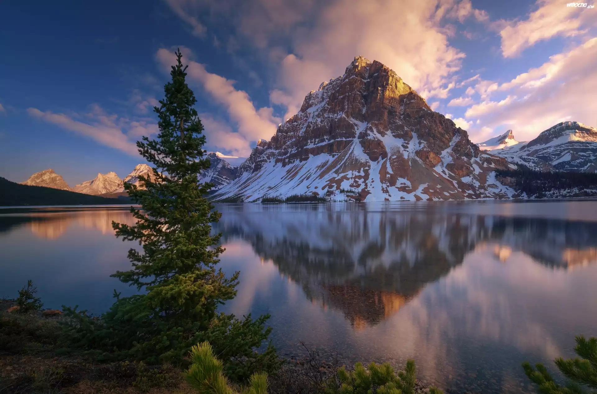 Zdjęcia, Kanada, Park Narodowy Banff, Góry, Szczyt Crowfoot Mountain, Jezioro Bow Lake, Drzewa