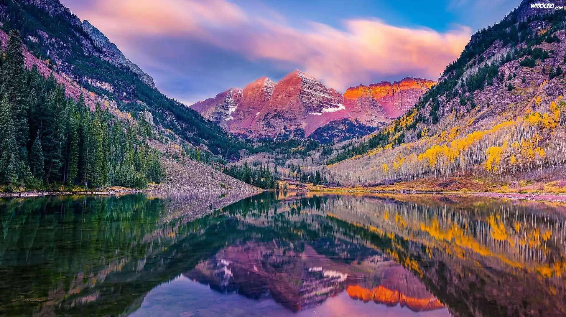 Zdjęcia, Stany Zjednoczone, Stan Kolorado, Góry, Szczyty Maroon Bells, Jezioro Maroon, Drzewa, Odbicie