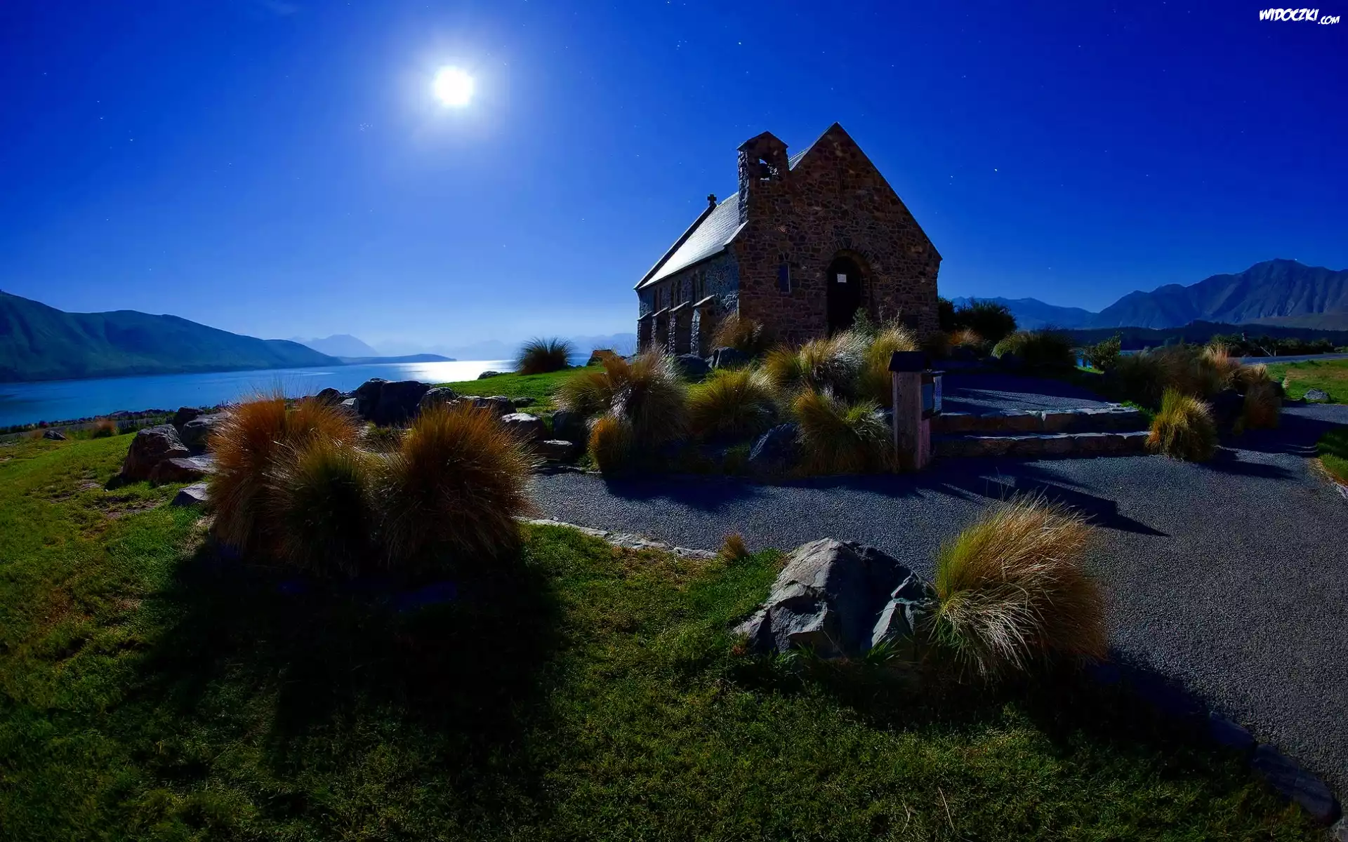 Szkocja, Noc, Góry, Jezioro, Kościół