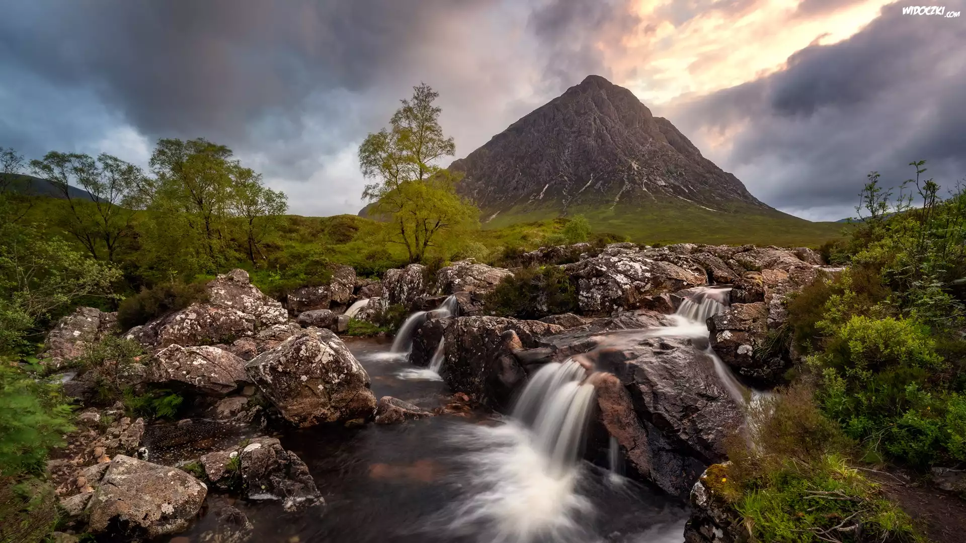 Szkocja, Rejon Highland, Dolina Glen Coe, Góra, Szczyt Buachaille Etive Mor, Rzeka Coupall, Skały, Roślinność, Chmury, Wschód słońca |