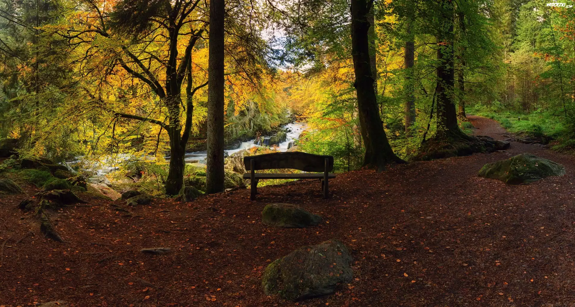 Szkocja, Las, Jesień, Rzeka, Ławka