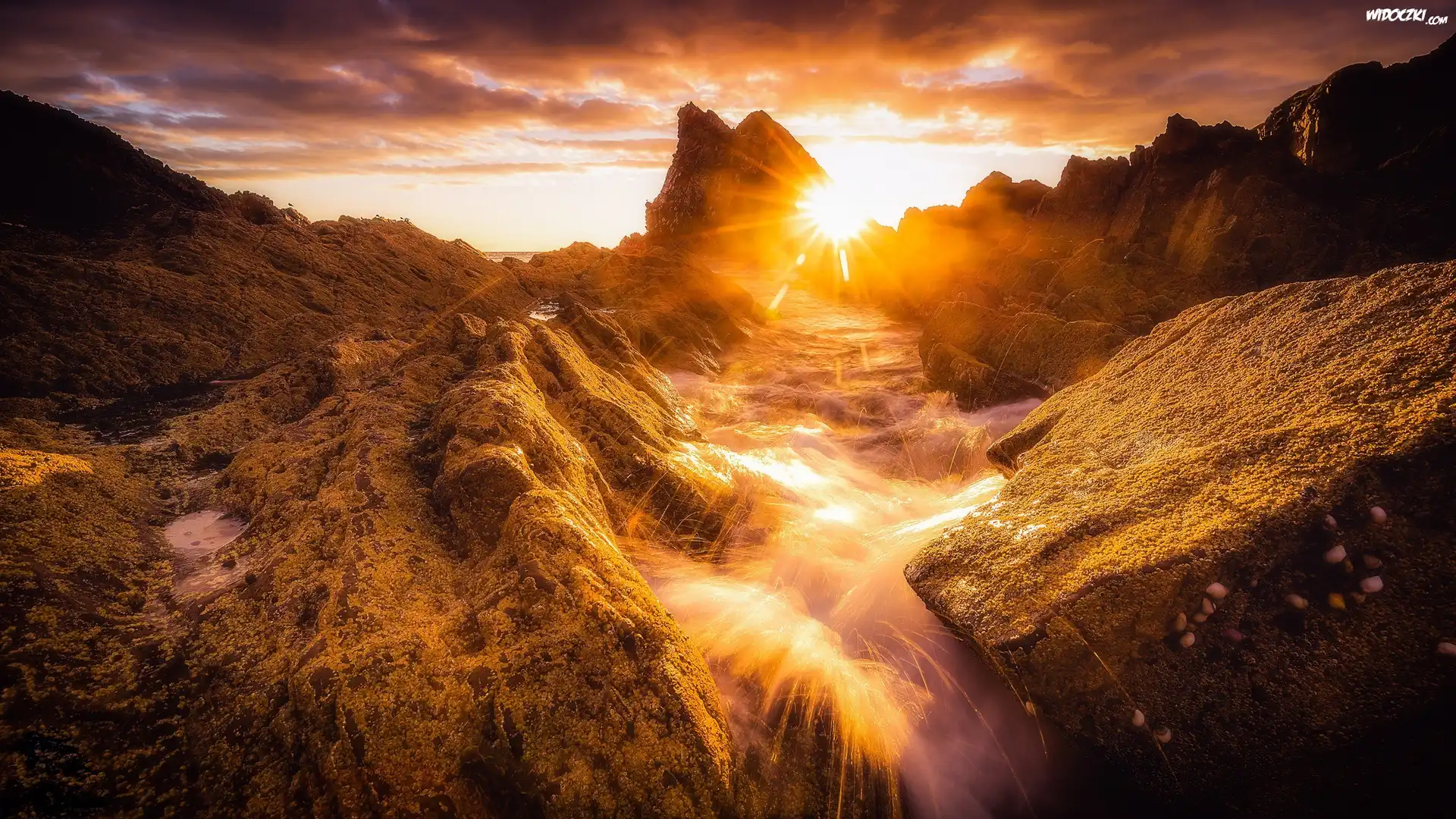 Zdjęcia, Szkocja, Wybrzeże Morayshire, Wschód słońca, Skały