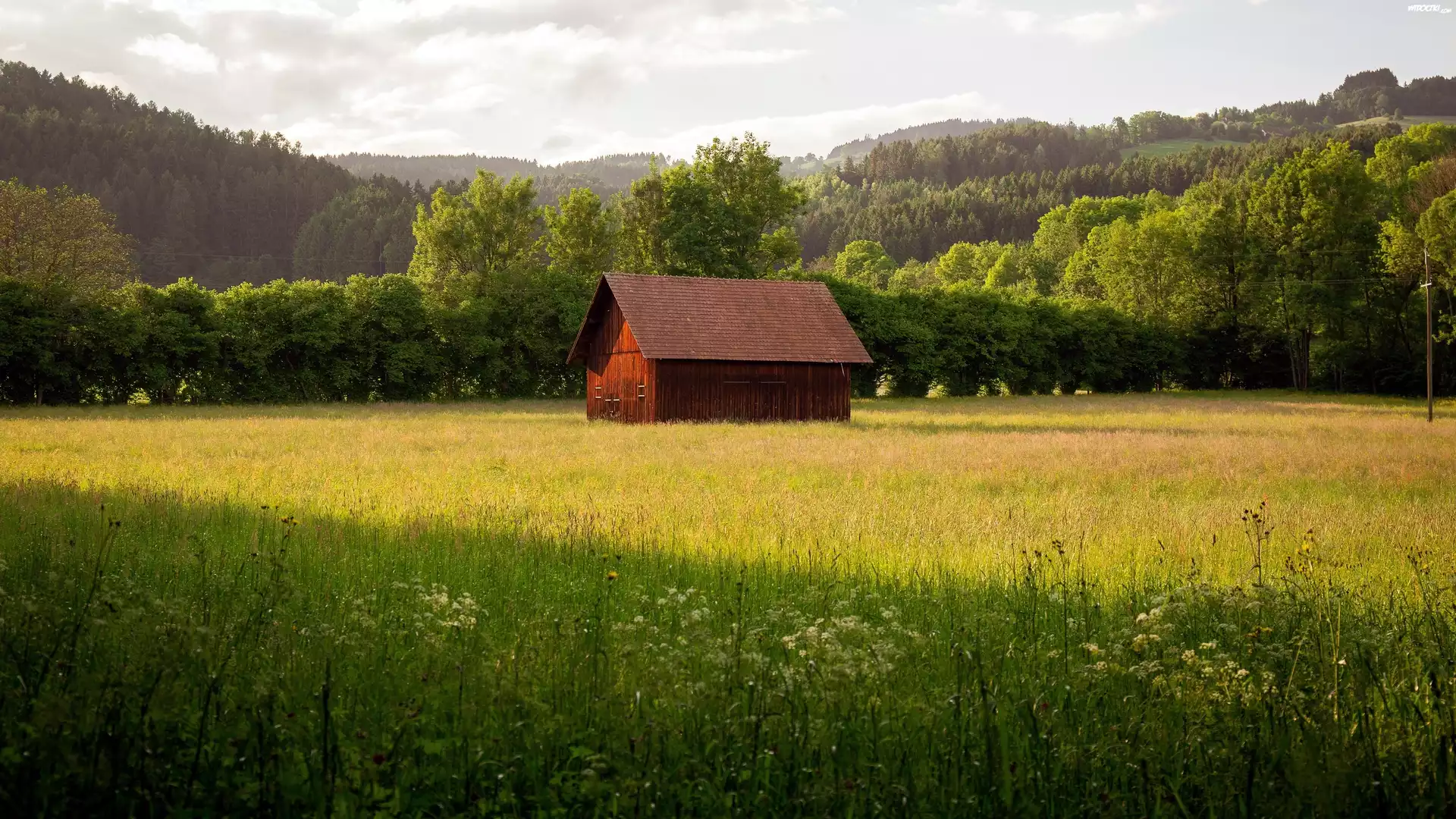 Dom, Szopa, Łąka, Kwiaty, Lasy, Drzewa, Góry