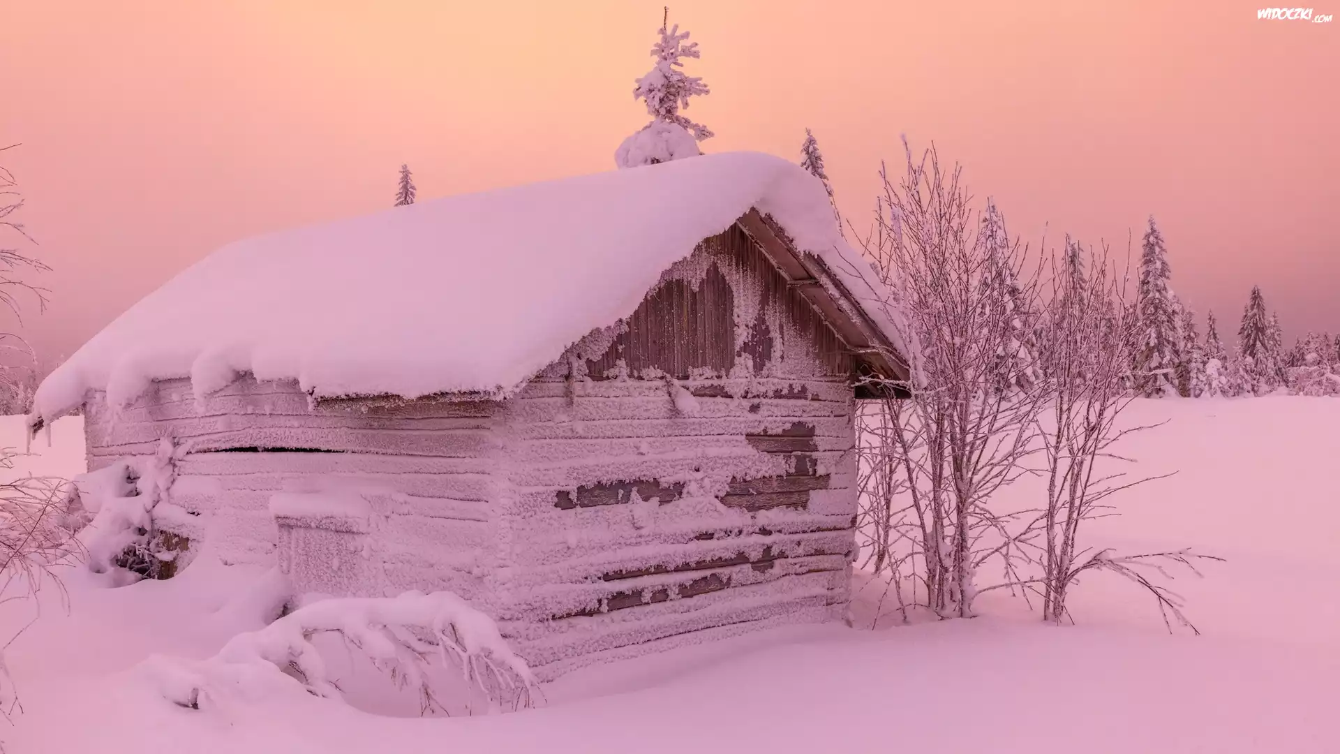 Zdjęcia, Zima, Szopa, Drewniana, Ośnieżona, Drzewa