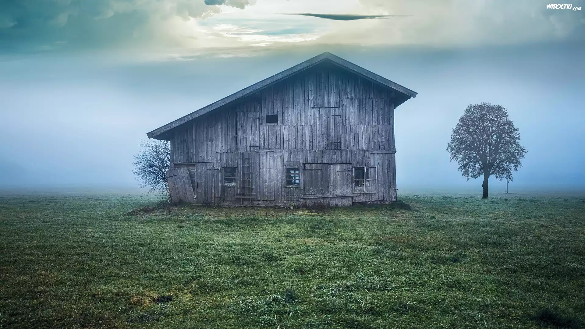 Zdjęcia, Drewniana, Szopa, Łąka, Pole, Drzewa, Mgła, Niebo