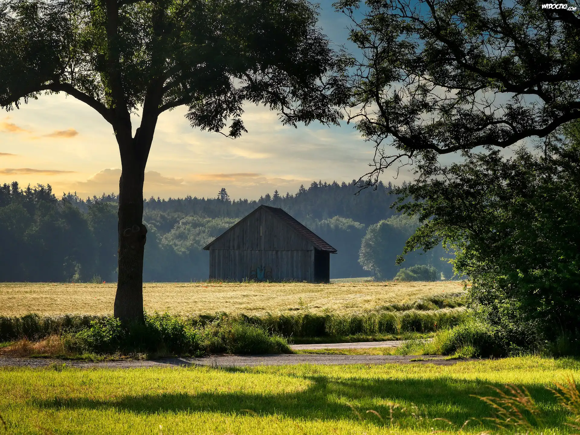 Zdjęcia, Szopa, Pole, Zboże, Droga, Drzewa, Las