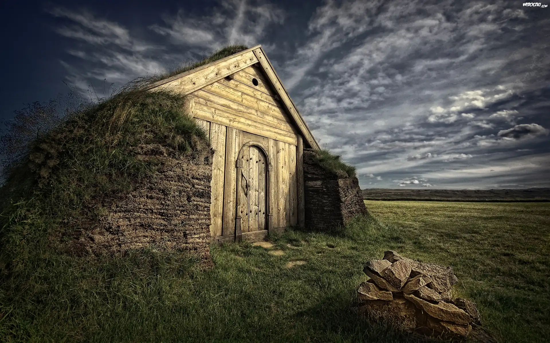 Zdjęcia, Szopa, Łąka, Kamienie, Chmury