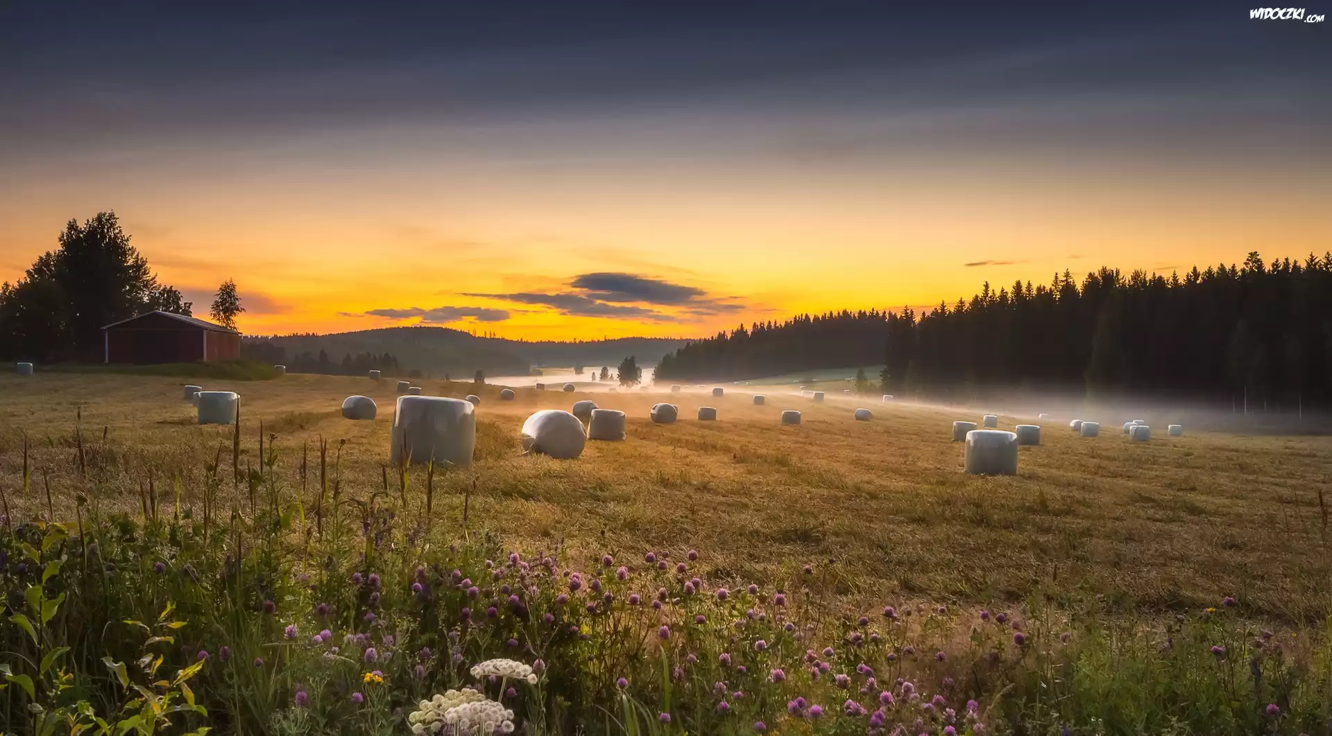 Zdjęcia, Finlandia, Region Pirkanmaa, Gmina Ruovesi, Łąka, Pole, Mgła, Las, Szopa