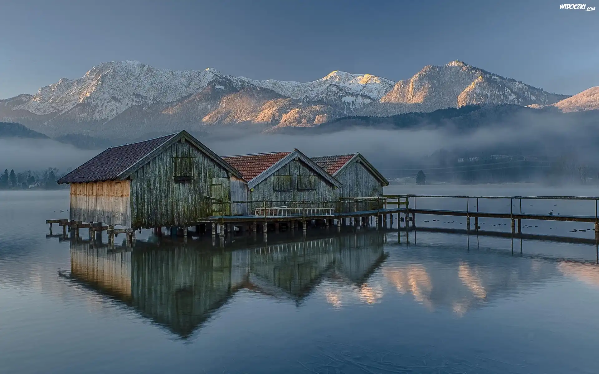 Zdjęcia, Jezioro, Szopy, Na, Wodzie, Góry, Lasy, Mgła, Zima