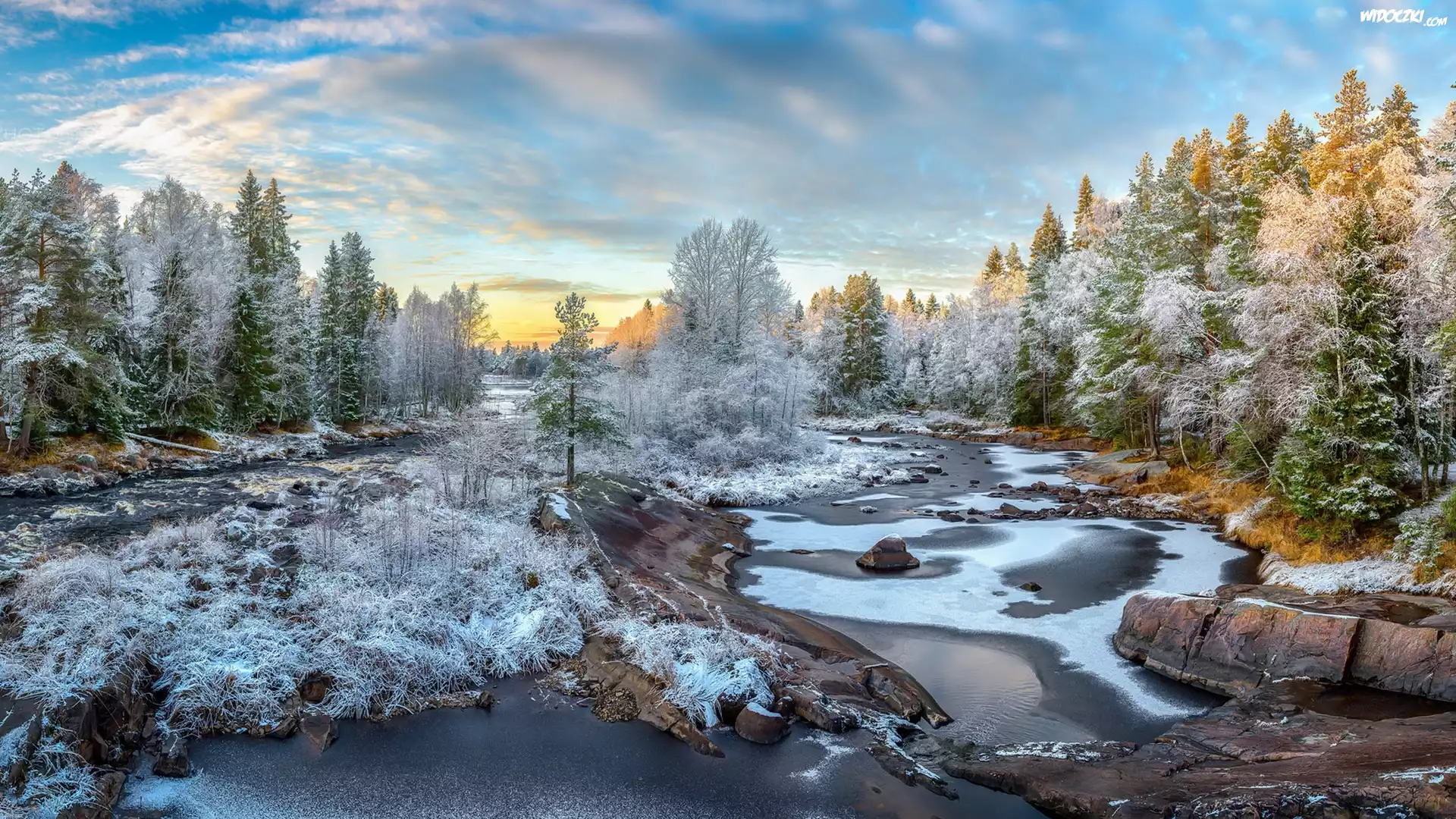 Finlandia, Szron, Rzeka Kiiminkijoki, Kamienie, Las, Drzewa