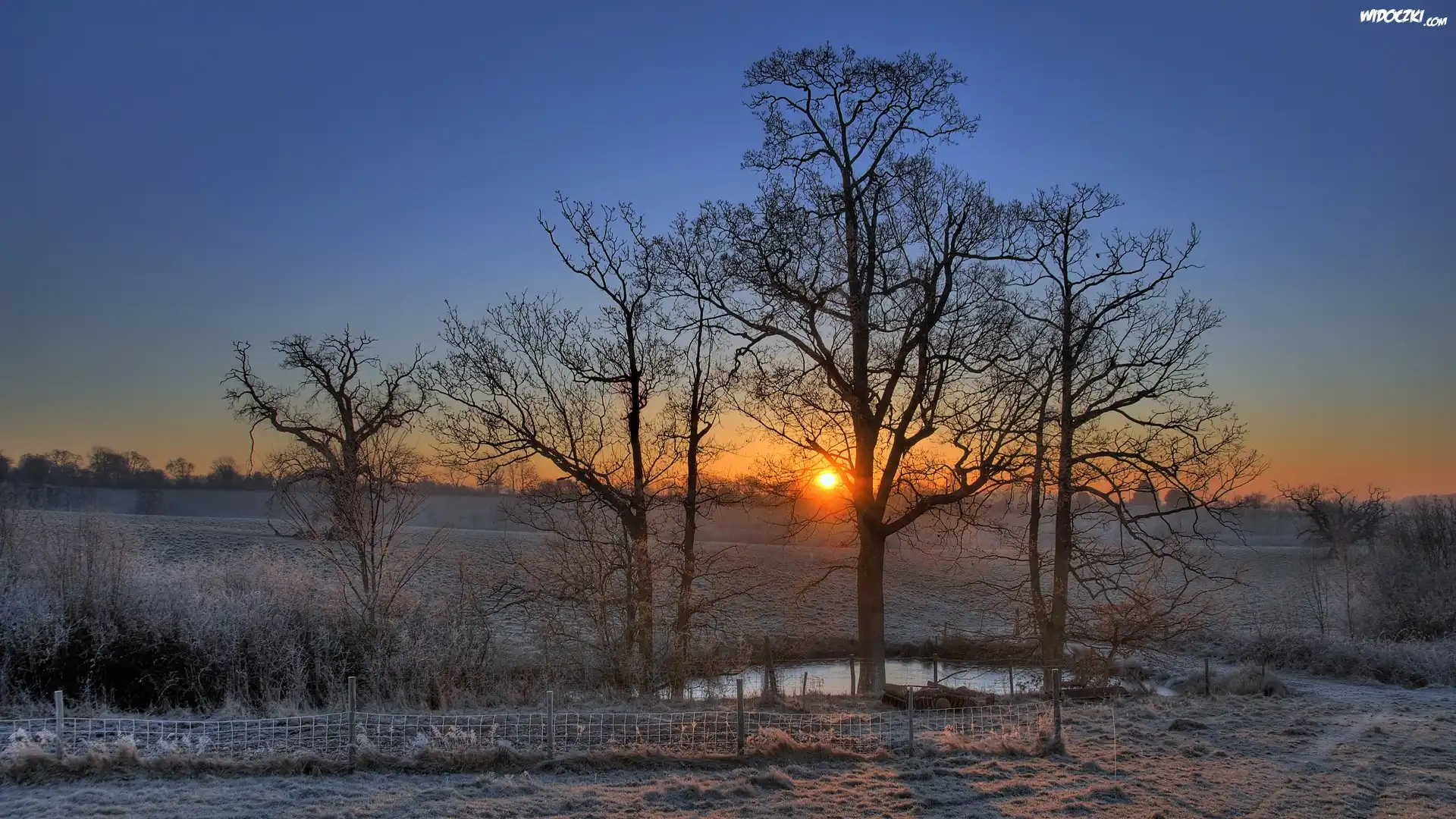 Zdjęcia, Szron, Łąka, Zachód Słońca, Drzewo