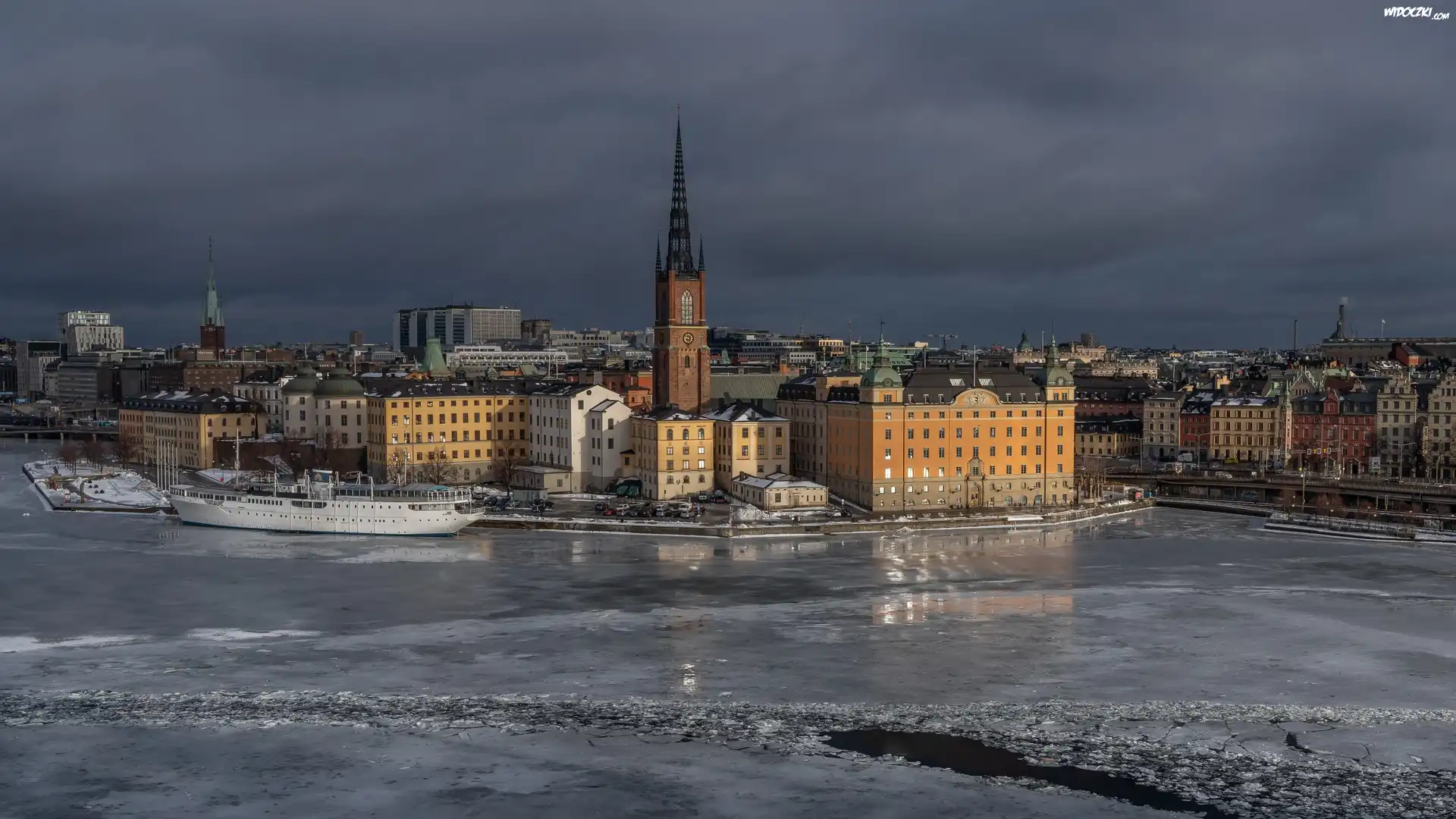 Szwecja, Sztokholm, Zima, Domy, Kościół, Zatoka Riddarfjarden