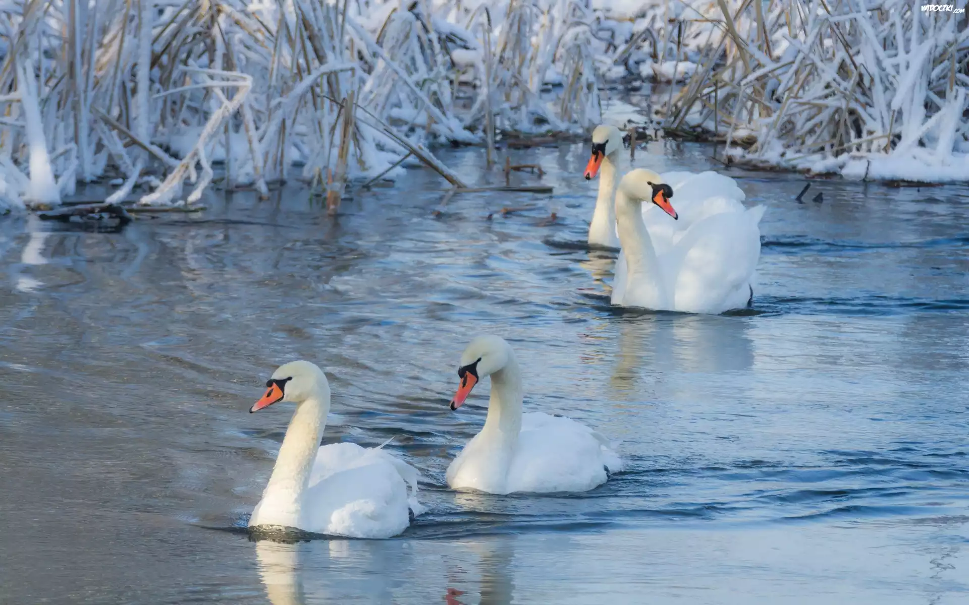 Zdjęcia, Łabędzie, Jezioro, Szuwary, Zima