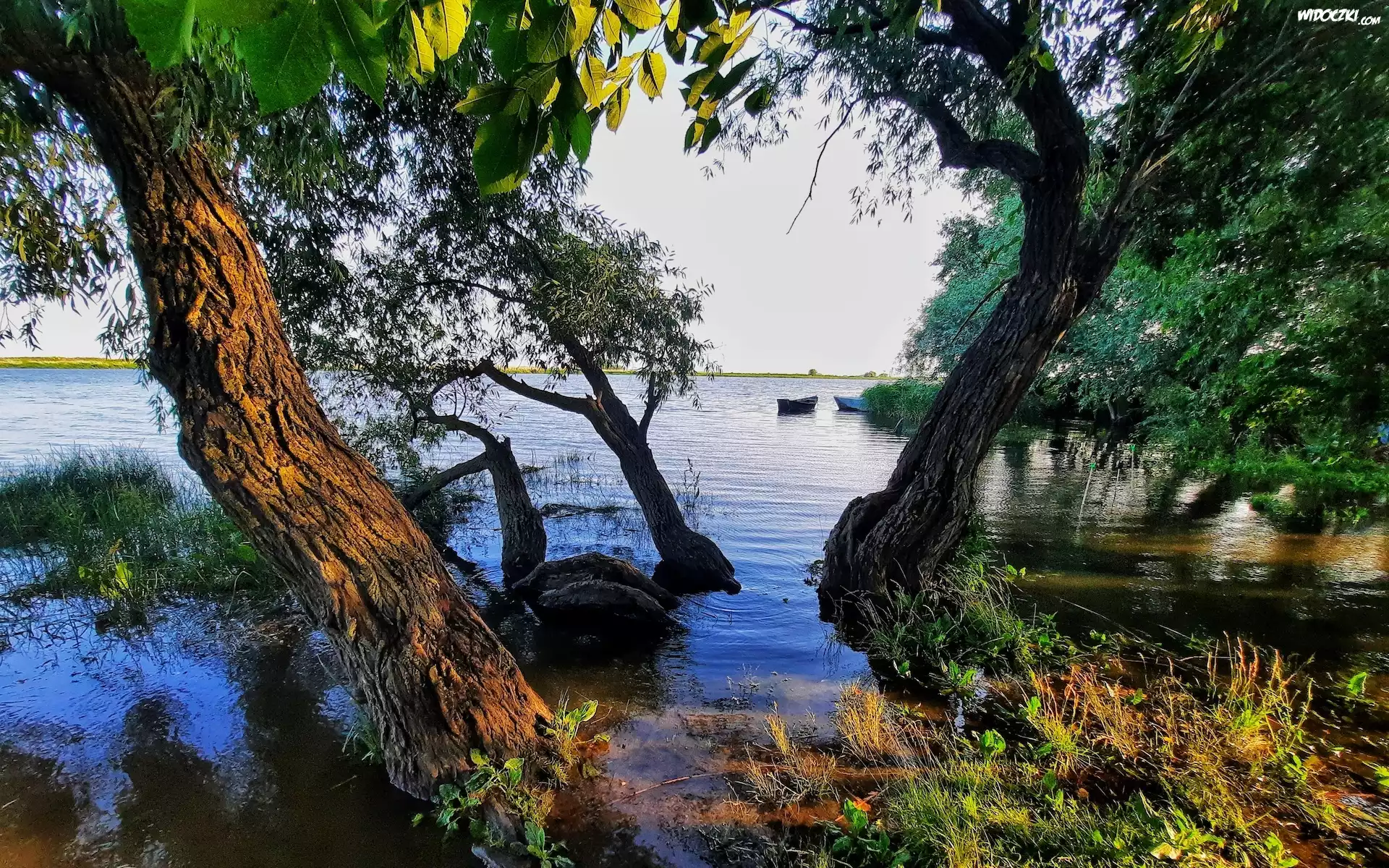 Jezioro, Drzewa, Łódki, Szuwary