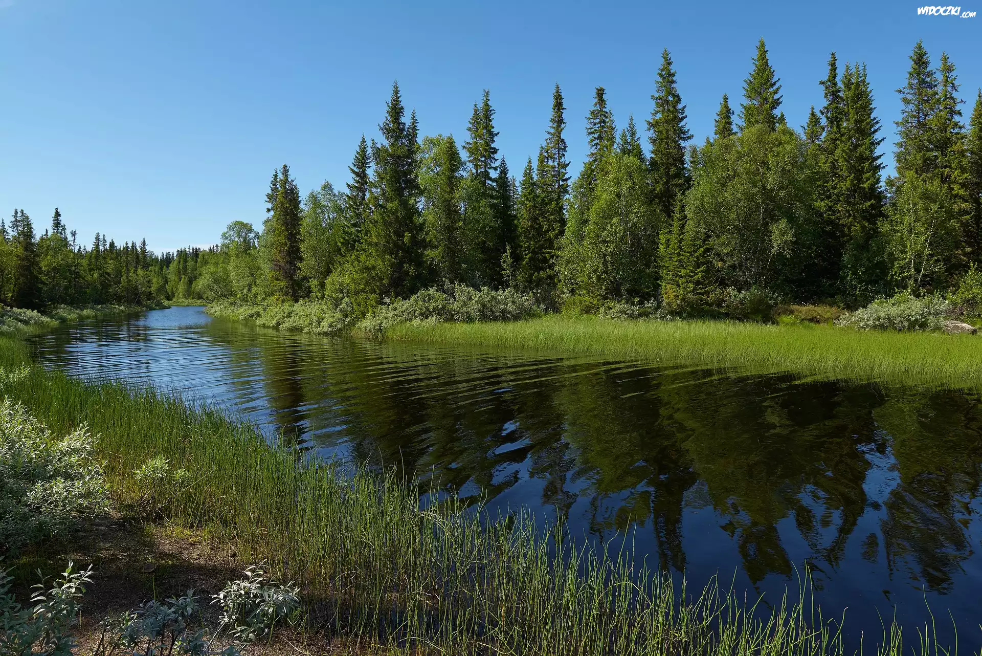 Zdjęcia, Rzeka, Las, Drzewa, Szuwary