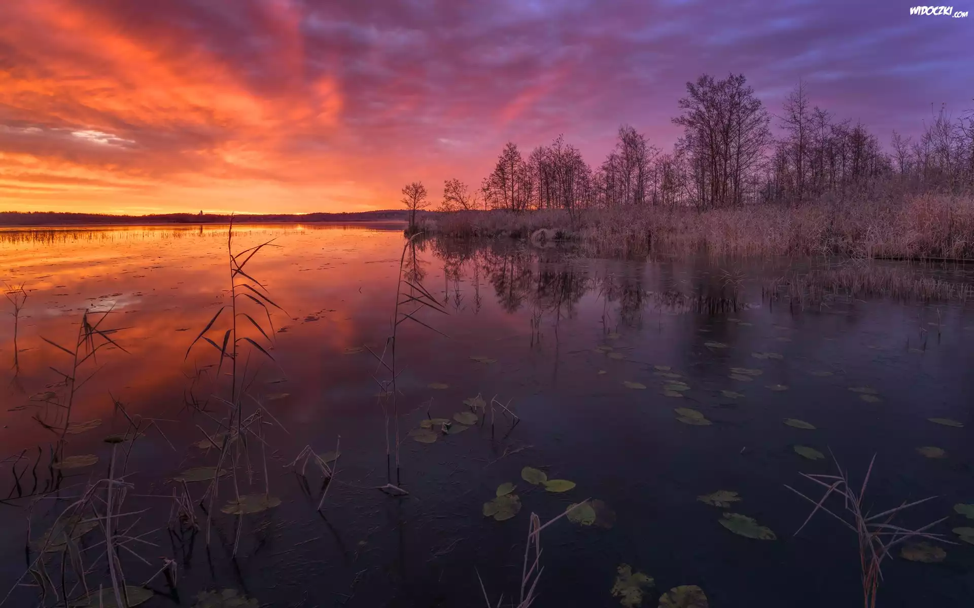 Zdjęcia, Jezioro, Drzewa, Trawa, Szuwary, Zachód słońca