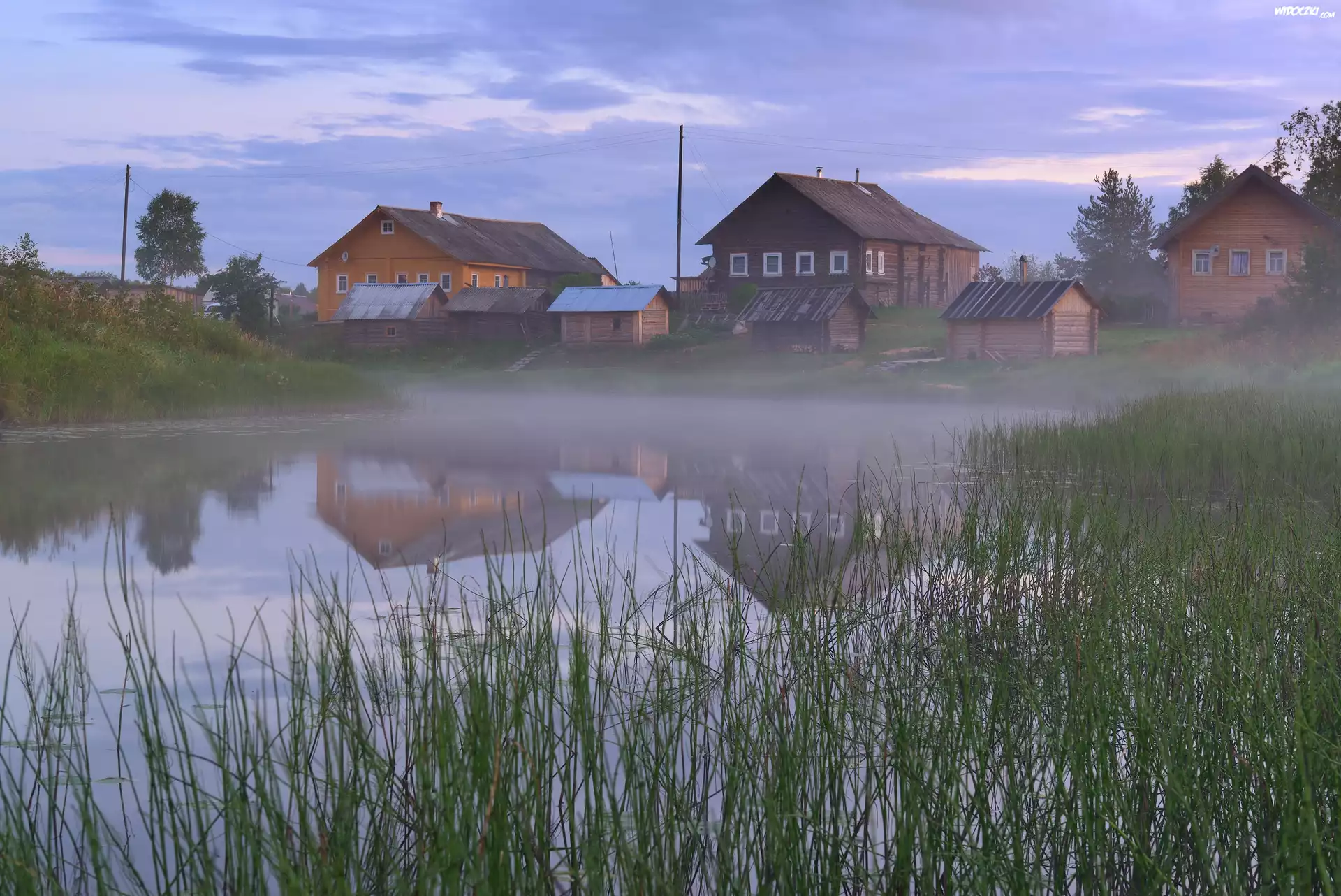 Zdjęcia, Staw, Szuwary, Drewniane, Domy, Mgła, Odbicie, Wieś