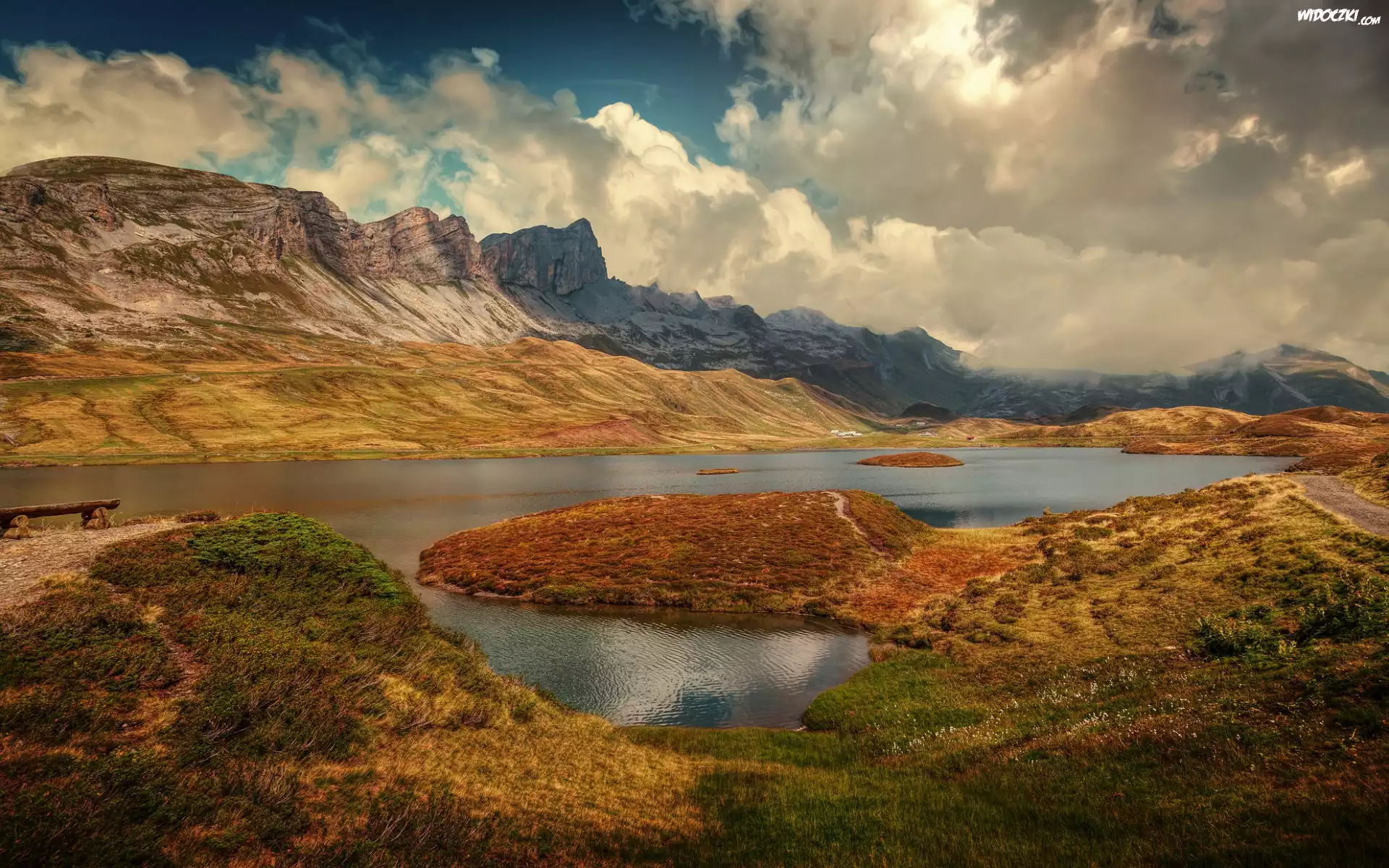 Jesień, Góry, Alpy, Chmury, Jezioro, Tannensee, Rośliny, Szwajcaria