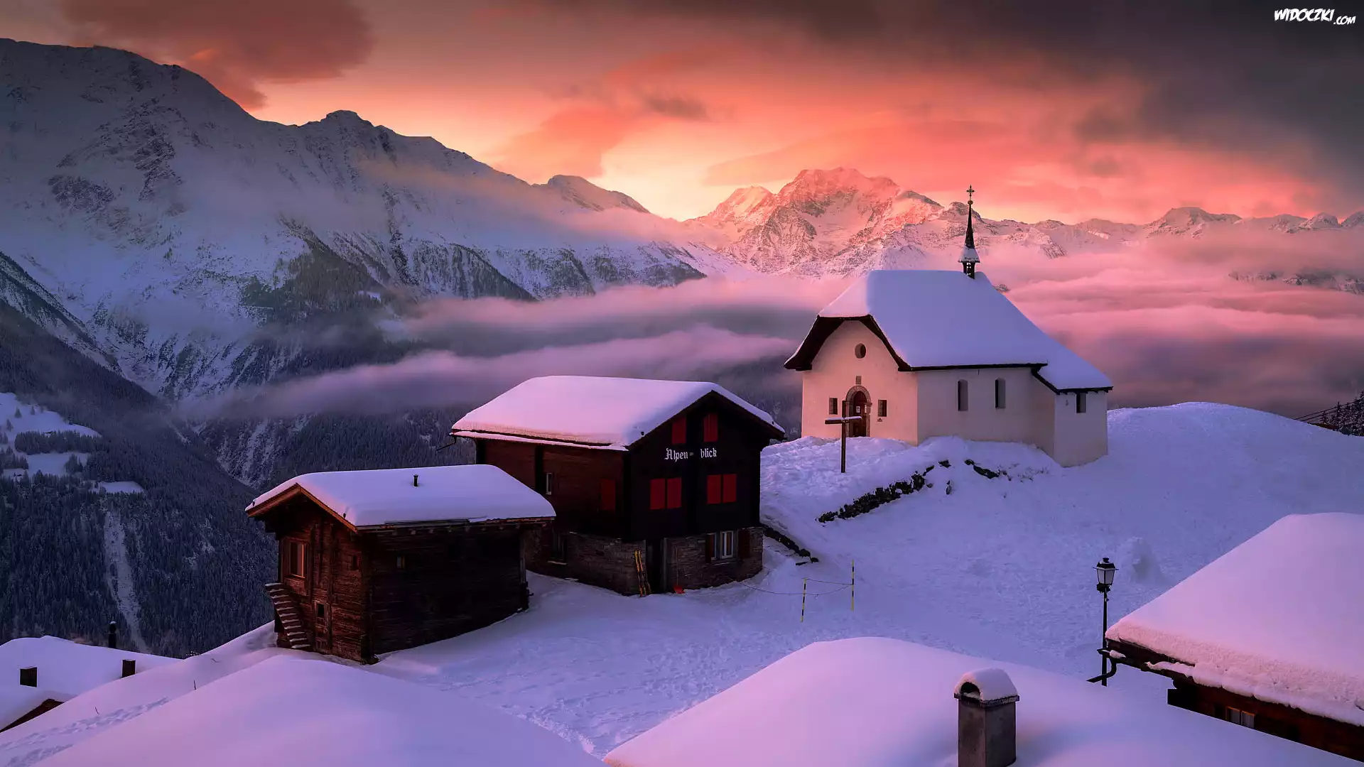 Zdjęcia, Zima, Góry, Alpy, Domy, Kościółek, Kaplica, Wschód słońca, Szwajcaria