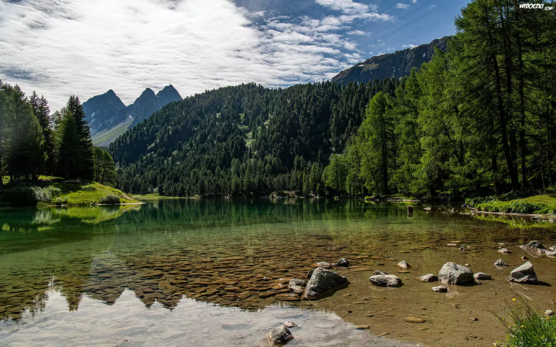 Zdjęcia, Jezioro, Lai da Palpuogna, Góry, Alpy Retyckie, Drzewa, Gryzonia, Szwajcaria
