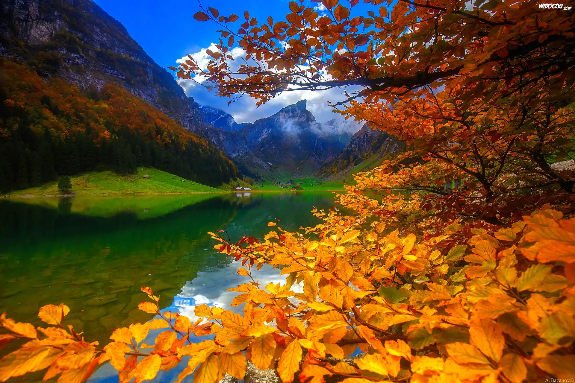 Szwajcaria, Jesień, Jezioro, Góry, Drzewa