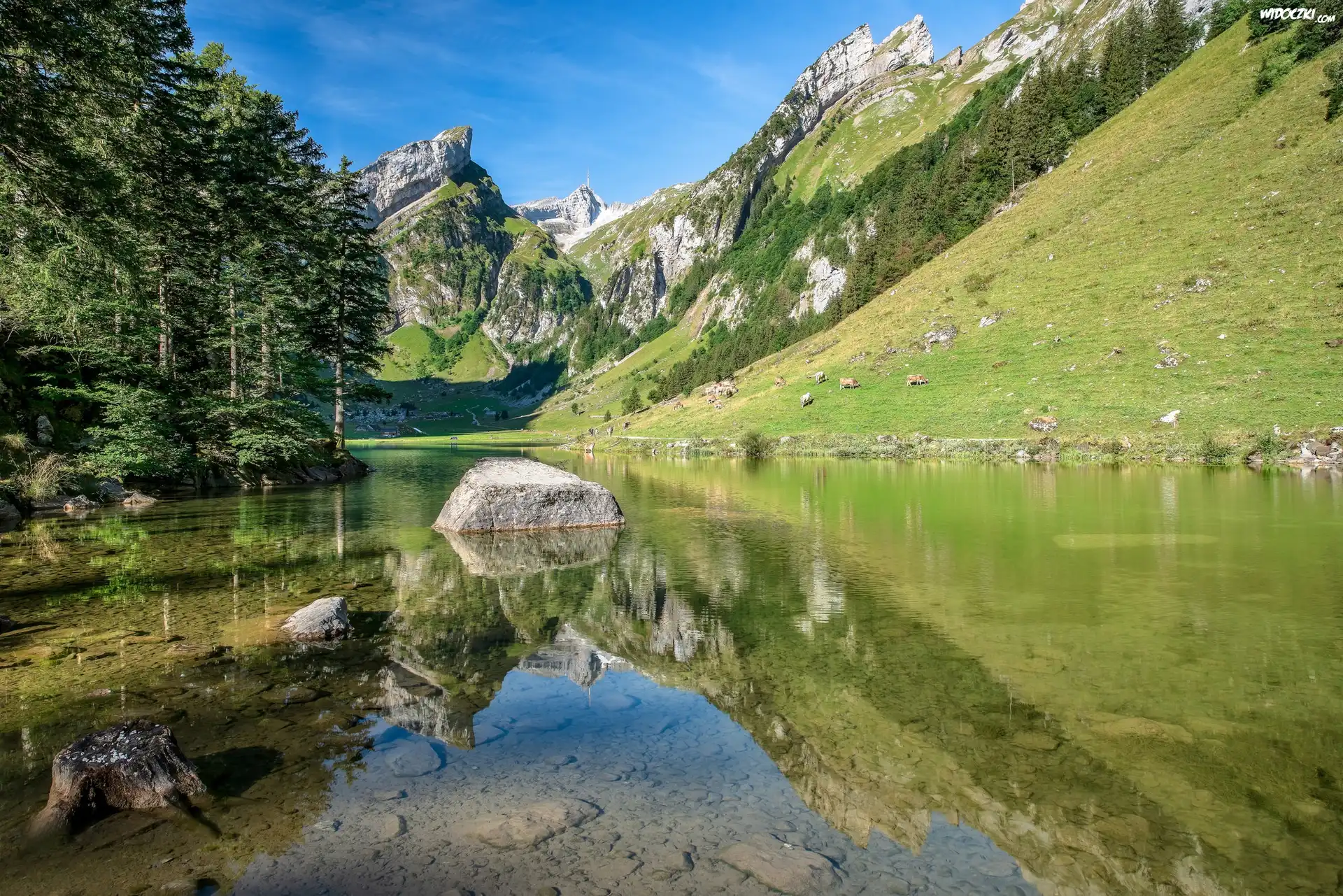 Zdjęcia, Jezioro Seealpsee, Góry Alpy, Kamienie, Drzewa, Kanton Appenzell Innerrhoden, Szwajcaria