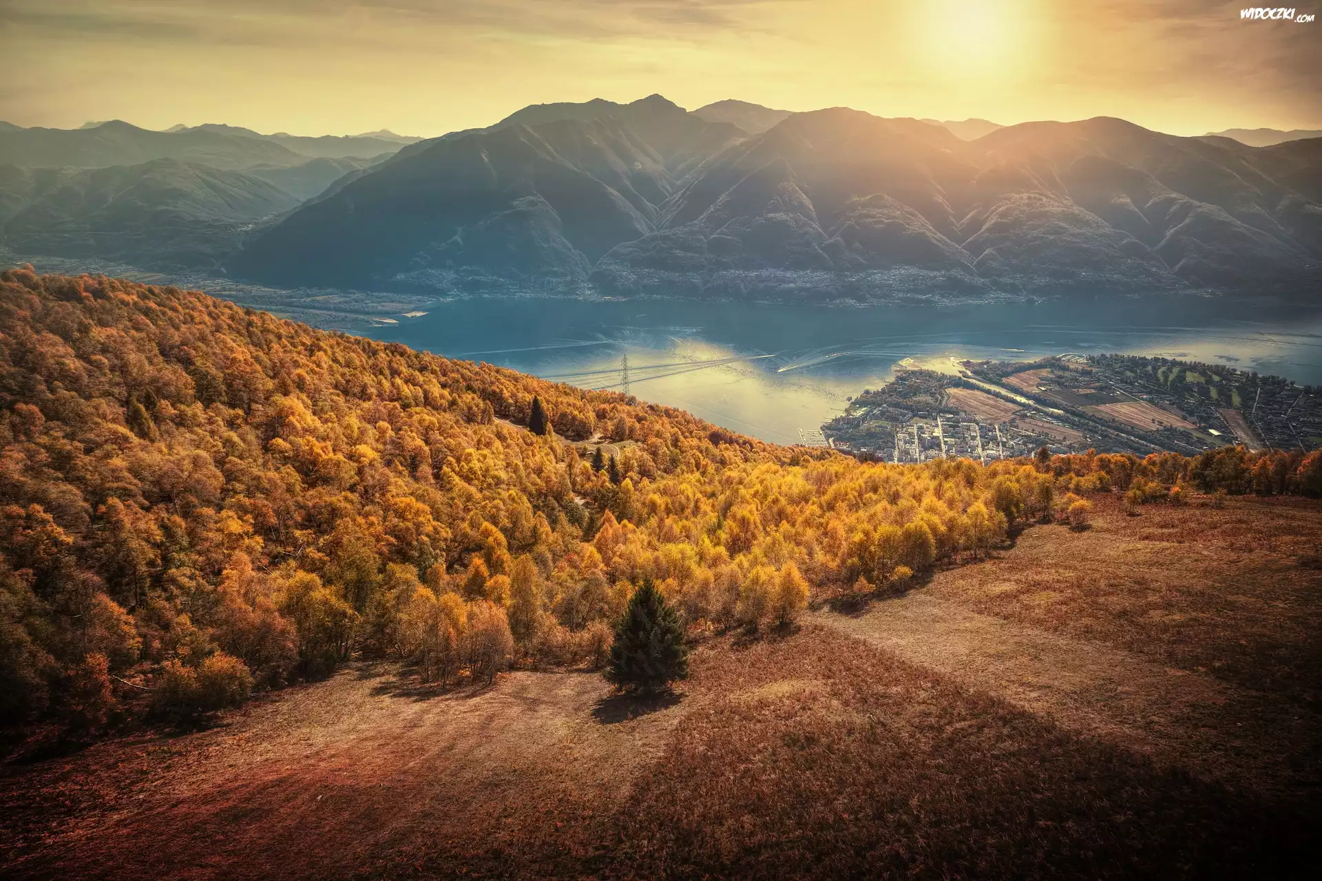 Szwajcaria, Kanton Ticino, Miasto Locarno, Góry Alpy, Jezioro Maggiore, Drzewa, Jesień, Wschód słońca |
