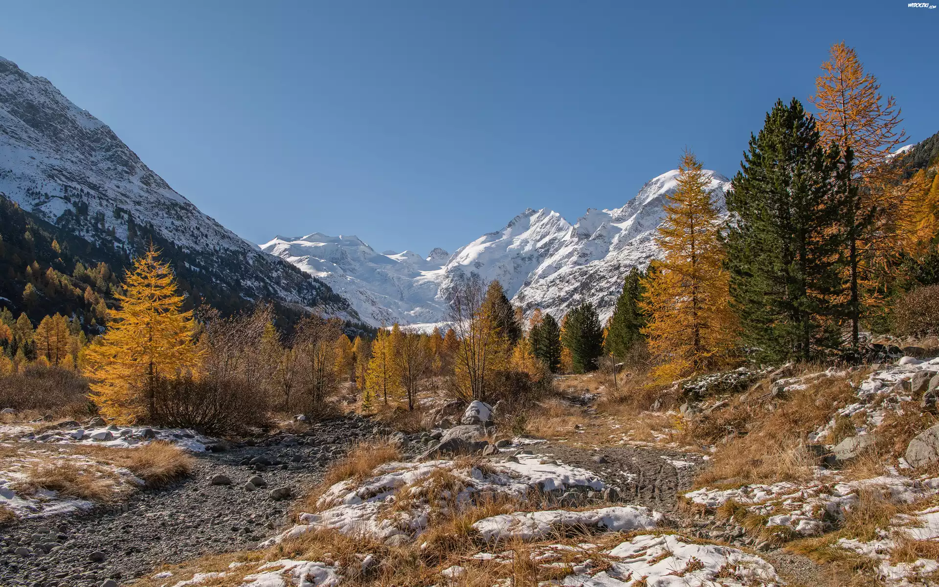 Szwajcaria, Kanton Gryzonia, Ośnieżone, Góry Alpy, Dolina Morteratsch, Pożółkłe, Drzewa, Kamienie, Śnieg, Zima |