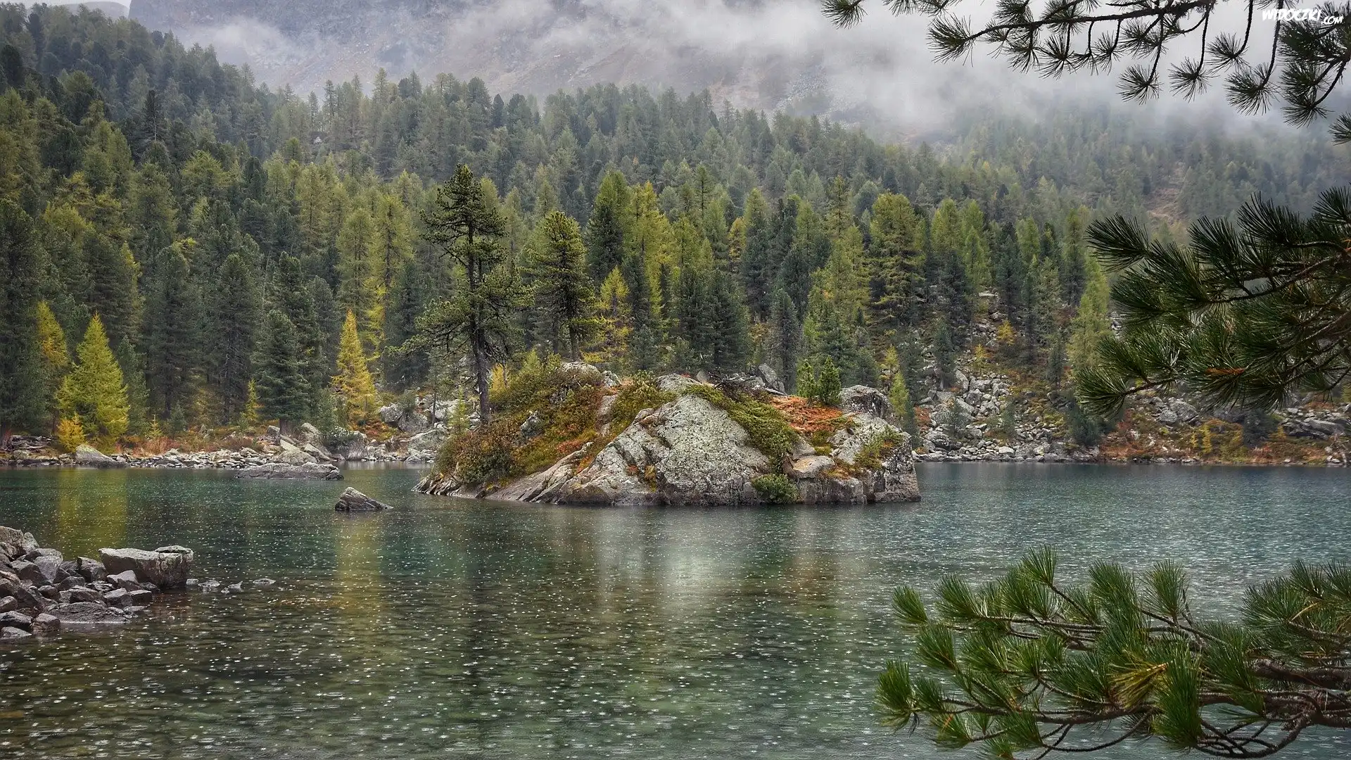 Zdjęcia, Jezioro Bergsee, Skała, Wysepka, Drzewa, Las, Kanton Berno, Szwajcaria