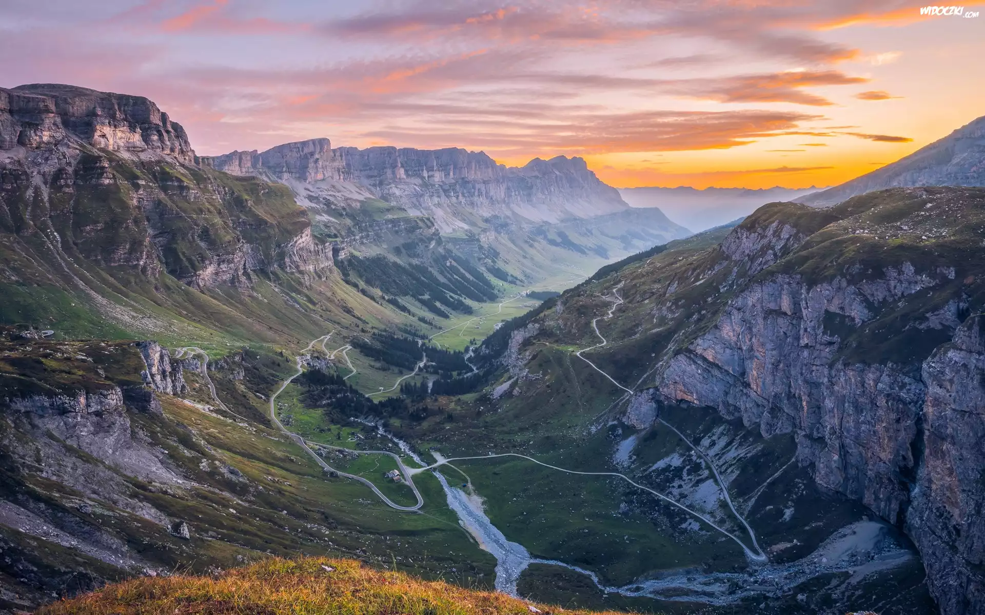 Zdjęcia, Szwajcaria, Góry, Alpy Glarneńskie, Przełęcz, Klausenpass, Drzewa, Wschód słońca, Chmury