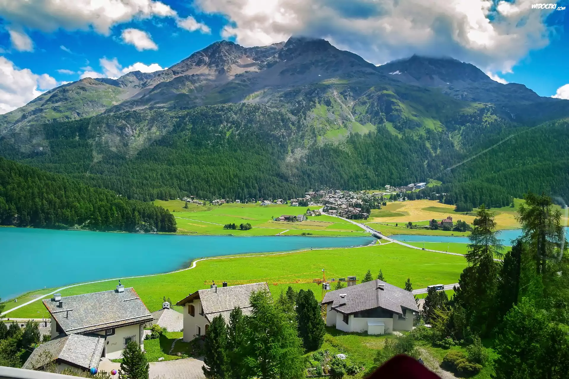 Zdjęcia, Góry, Alpy, Domy, Wieś Surlej, Jezioro Silvaplanersee, Kanton Gryzonia, Szwajcaria