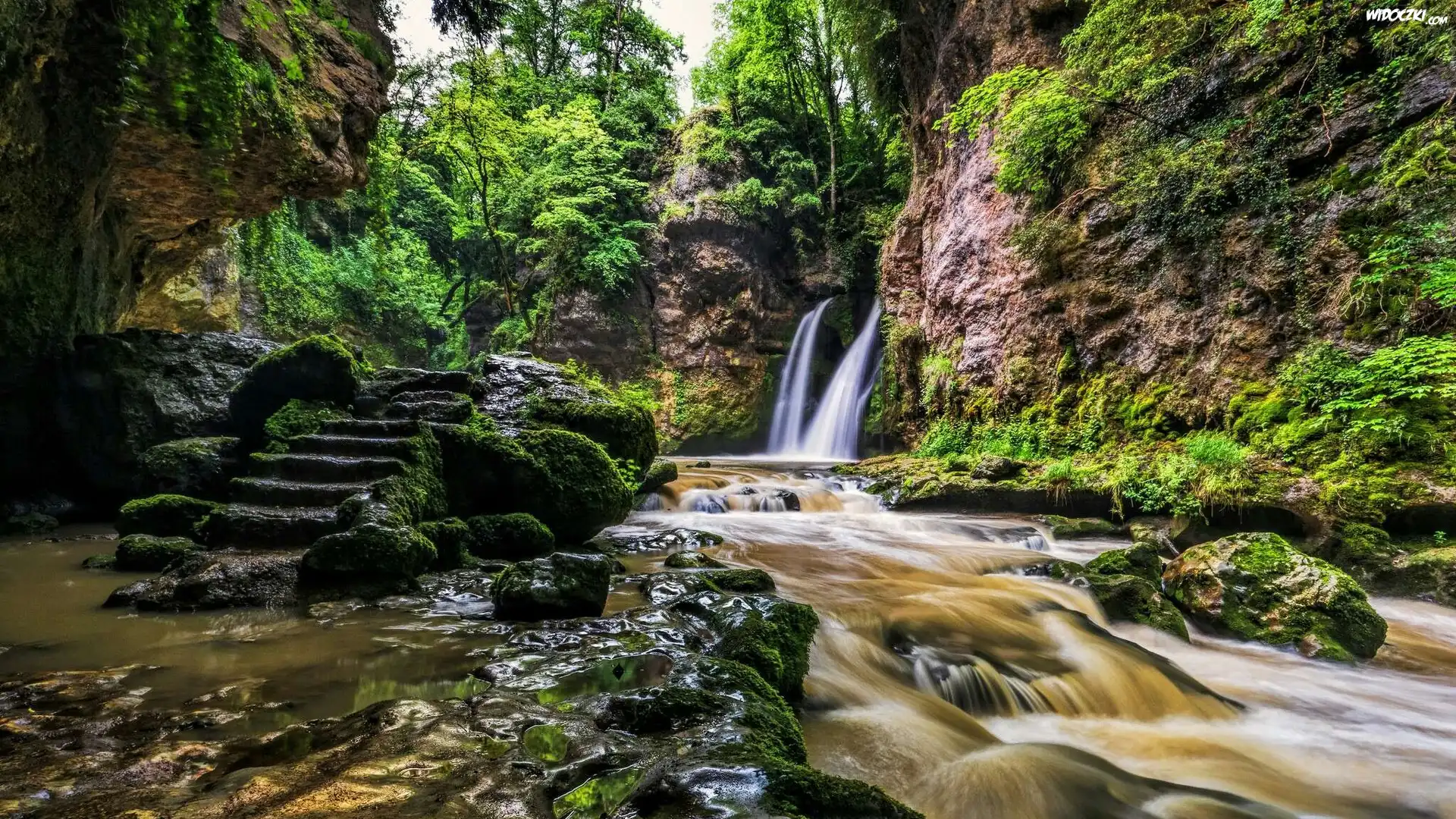 Szwajcaria, Kanton Vaud, Gmina La Sarraz, Rzeka Venoge, Wodospad Tine de Conflens, Skały, Schody, Kamienie, Rzeka, Drzewa |