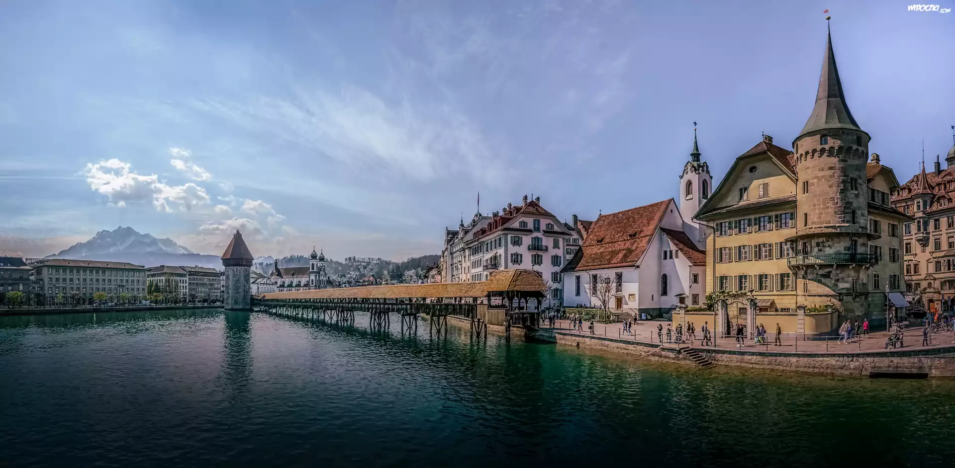 Zdjęcia, Szwajcaria, Lucerna, Most Kapellbrucke, Rzeka Reuss, Wieża, Góry, Domy