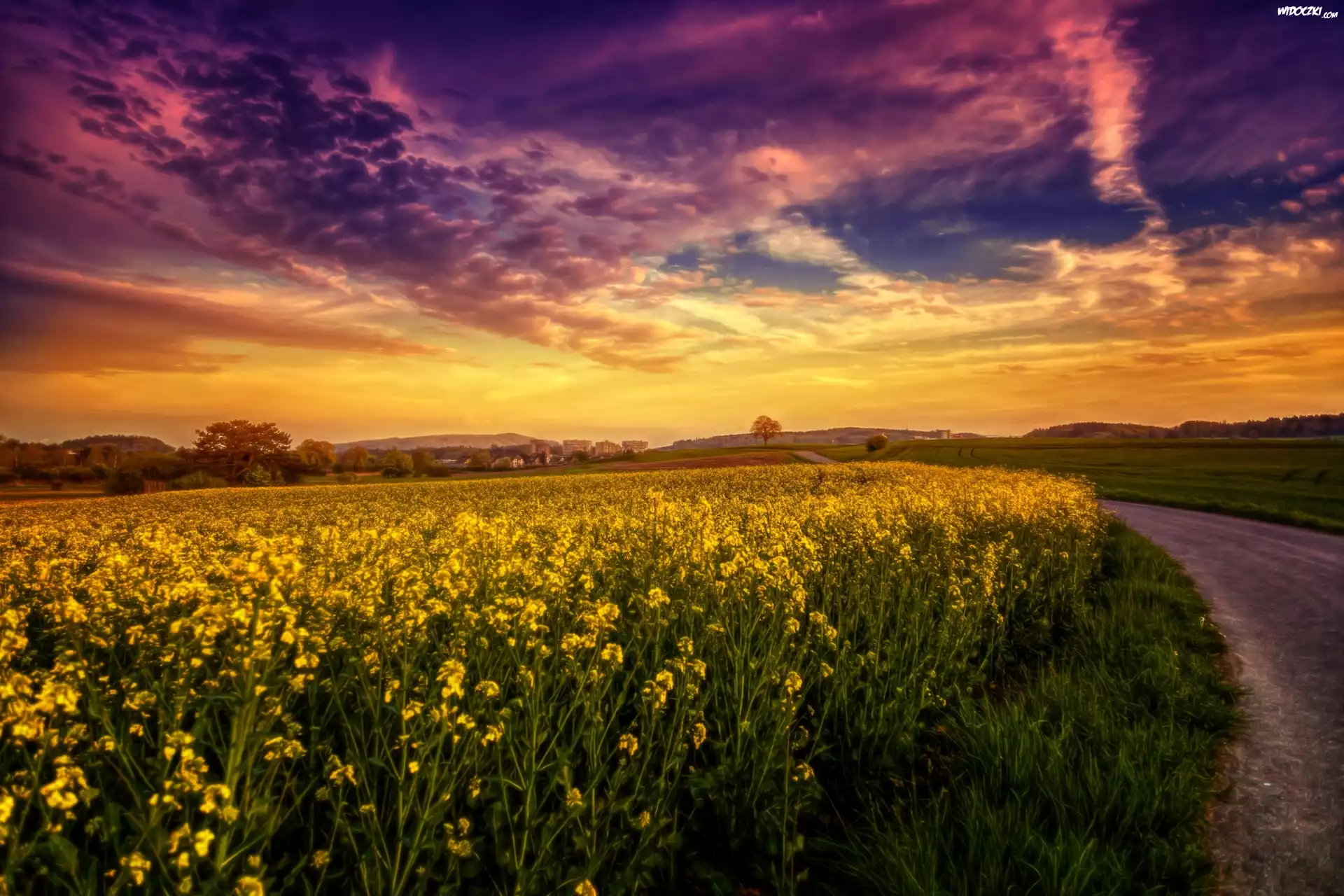 Lokomotywa Wiosna, Dróżka, Samotne, Drzewko Zielone, Wzgórza, Budynki Pole, Samolot Zachód, Słońca, Pole Bele, Słomy Niebo, Pola, Rośliny Droga, Pola Widok, Jezioro, Ławeczki Krajobraz Zachód, Słońca, Zielone, Pola Widok, Droga, Góry, Ławka Góry, Niebo, 3d Krajobraz, ciemne, chmury
