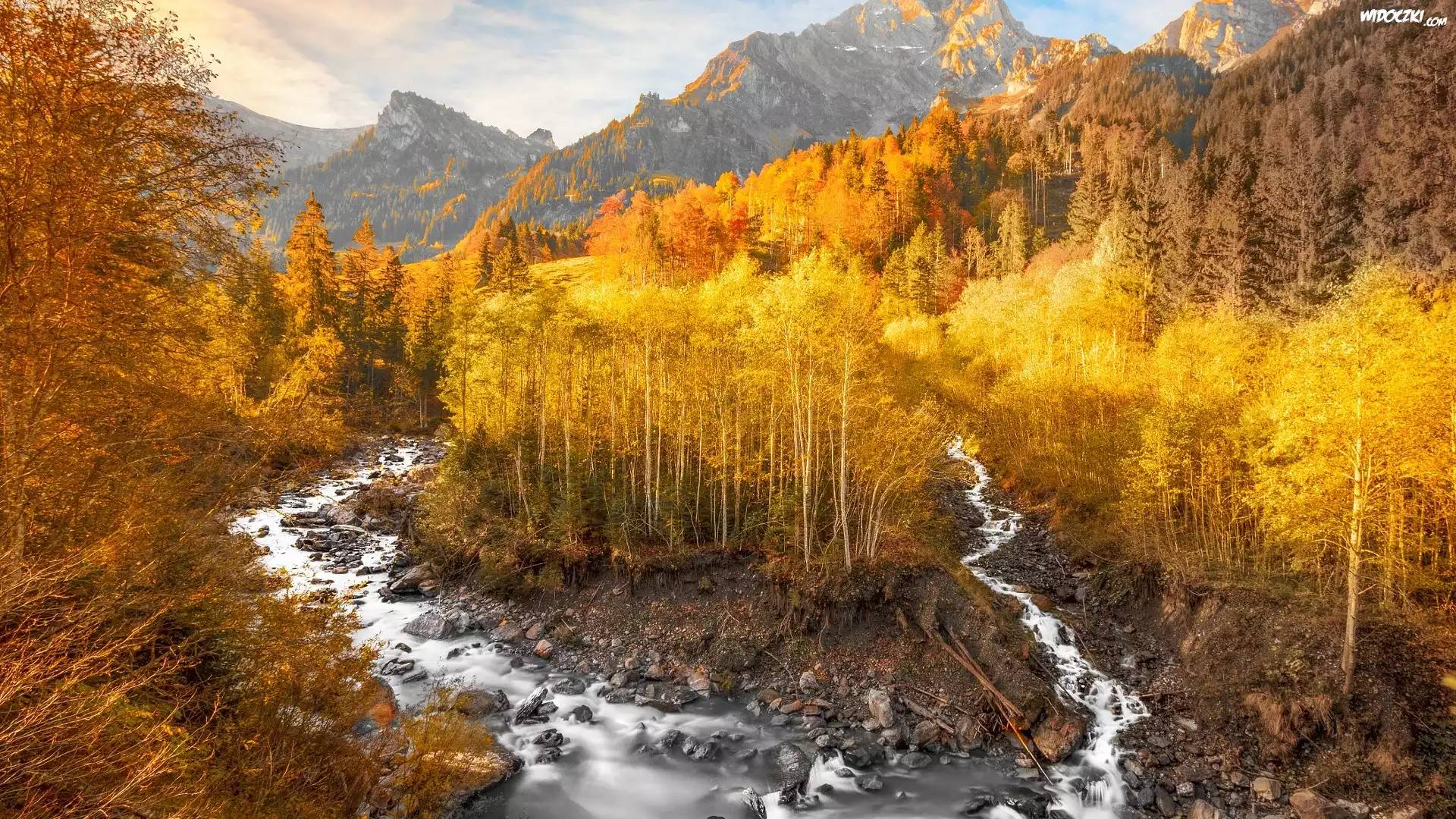 Zdjęcia, Jesień, Góry, Żółte, Drzewa, Kamienie, Rzeka, Grindelwald, Szwajcaria