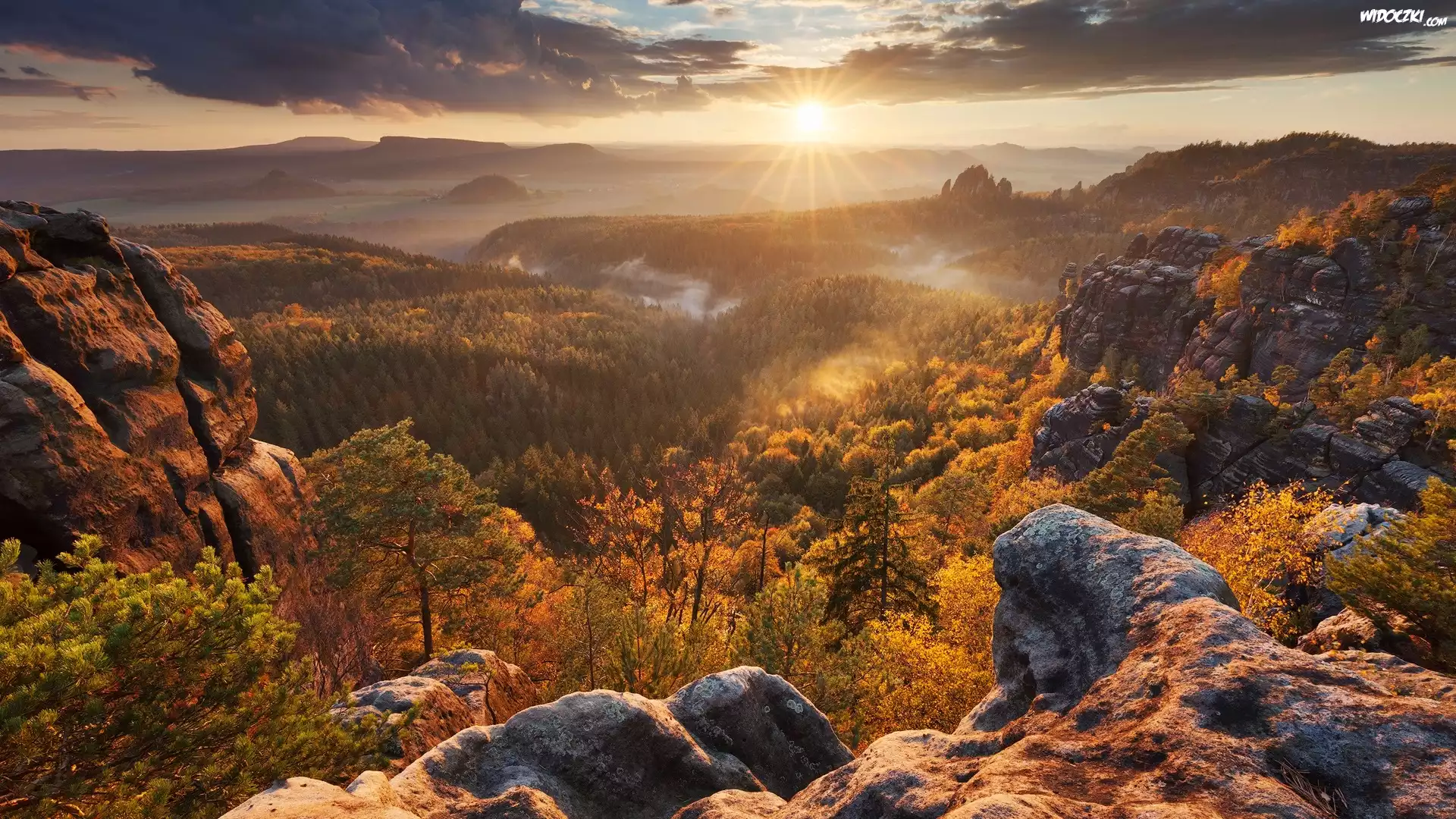 Park Narodowy Saskiej Szwajcarii, Jesień, Góry Połabskie, Drzewa, Lasy, Skały, Promienie słońca, Niemcy |