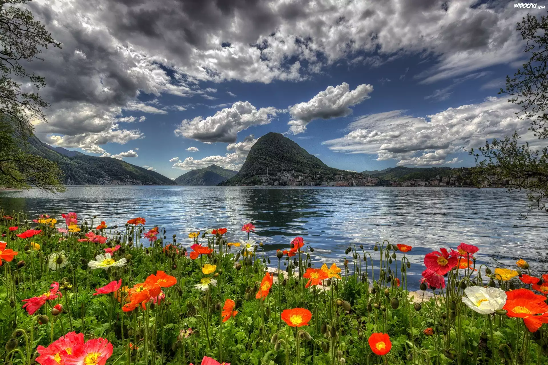 Szwajcarskie, Miasteczko, Jezioro, Chmury, Maki