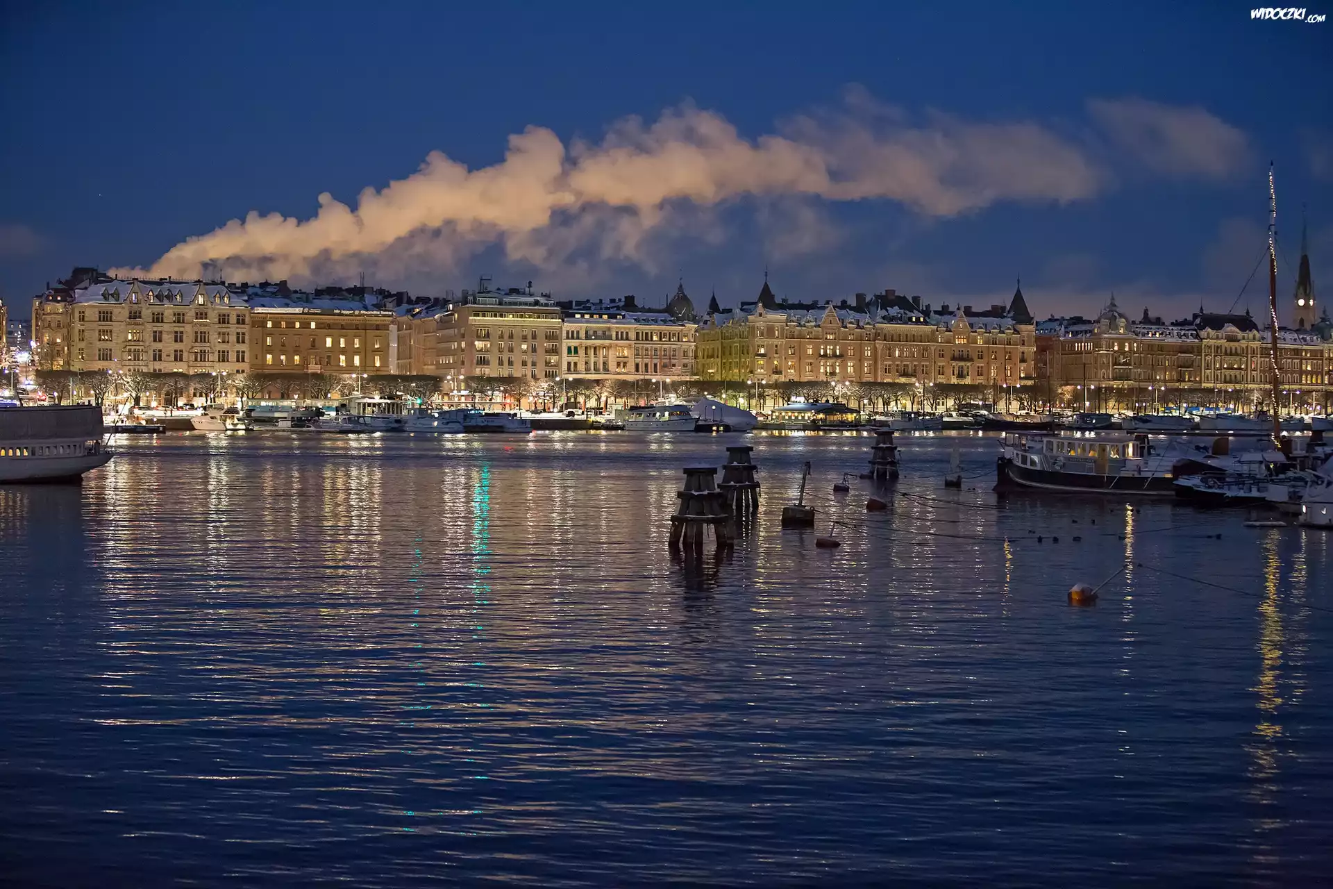 Szwecja, Sztokholm, Miasto, Noc, Morze, Łodzie