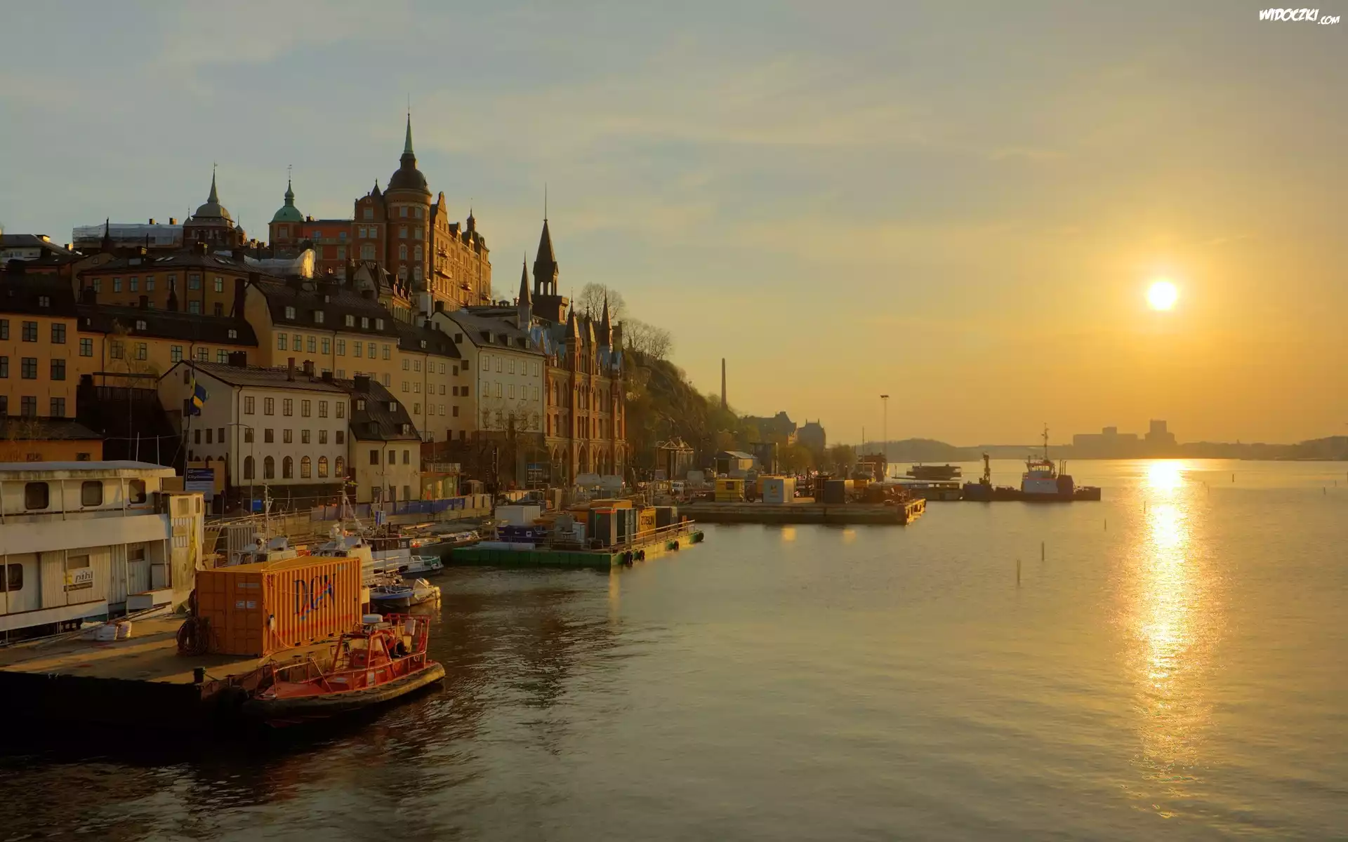Zdjęcia, Szwecja, Sztokholm, Wybrzeże, Wschód, Słońca, Łódka