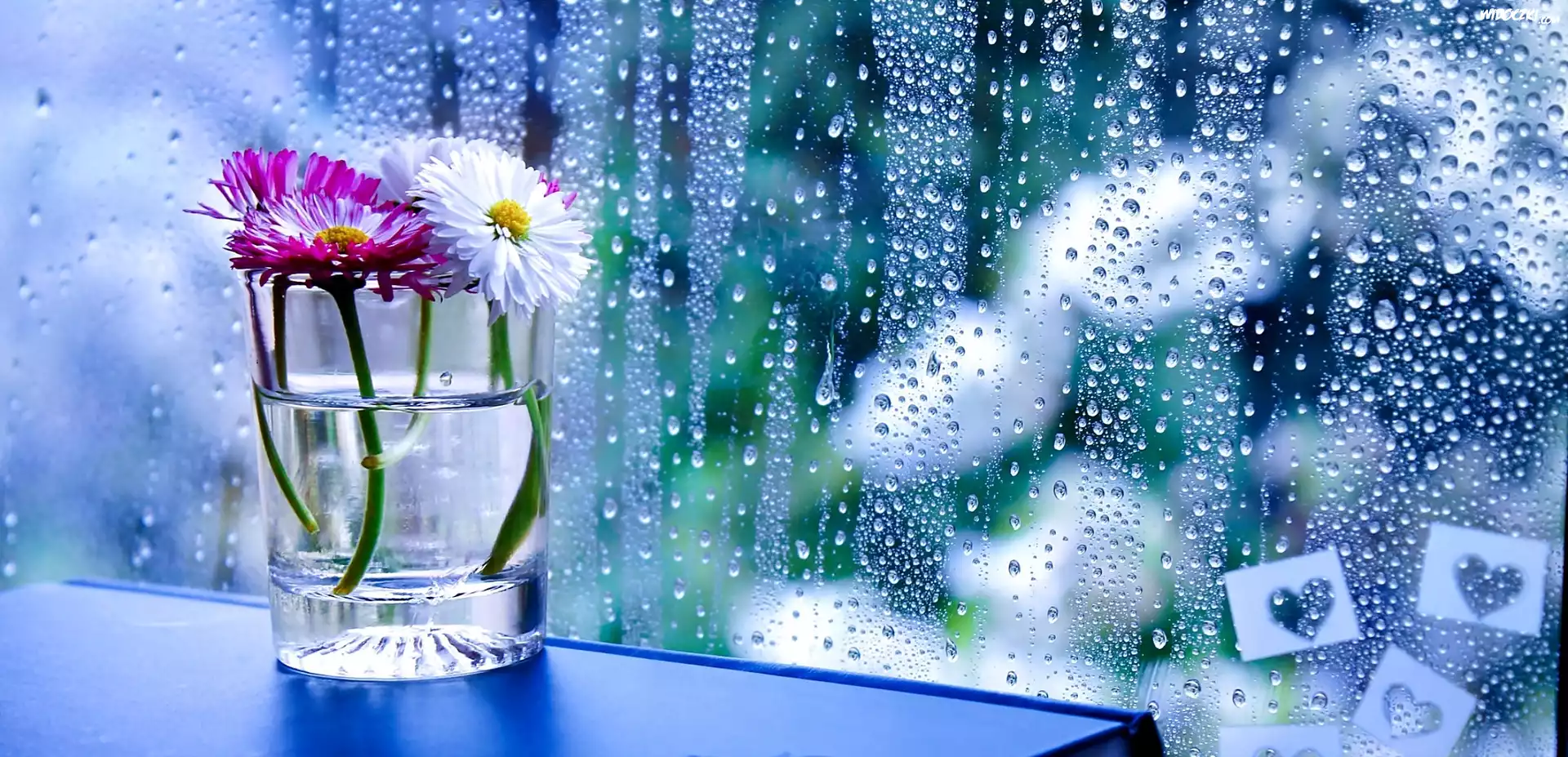 Zdjęcia, Kwiaty, Szyba, Deszcz