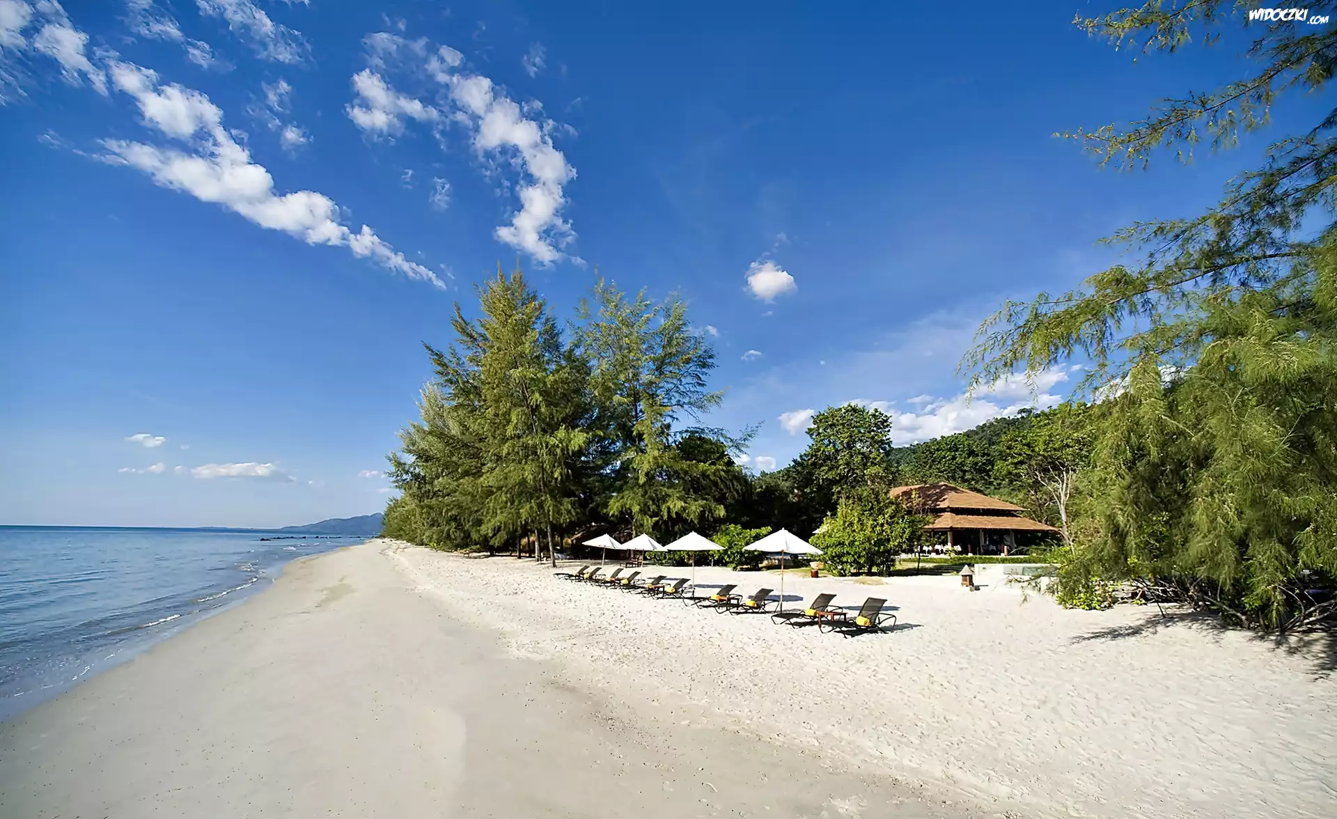 Tajlandia, Morze, Plaża, Leżaki, Drzewa, Wakacje