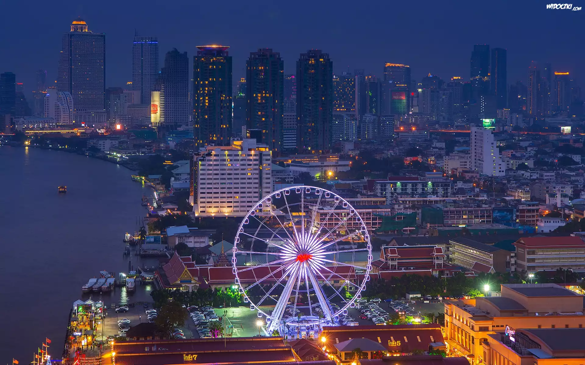Drapacze, Chmur, Wieżowce, Rzeka, Łodzie, Panorama, Miasta, Noc, Bangkok, Tajlandia