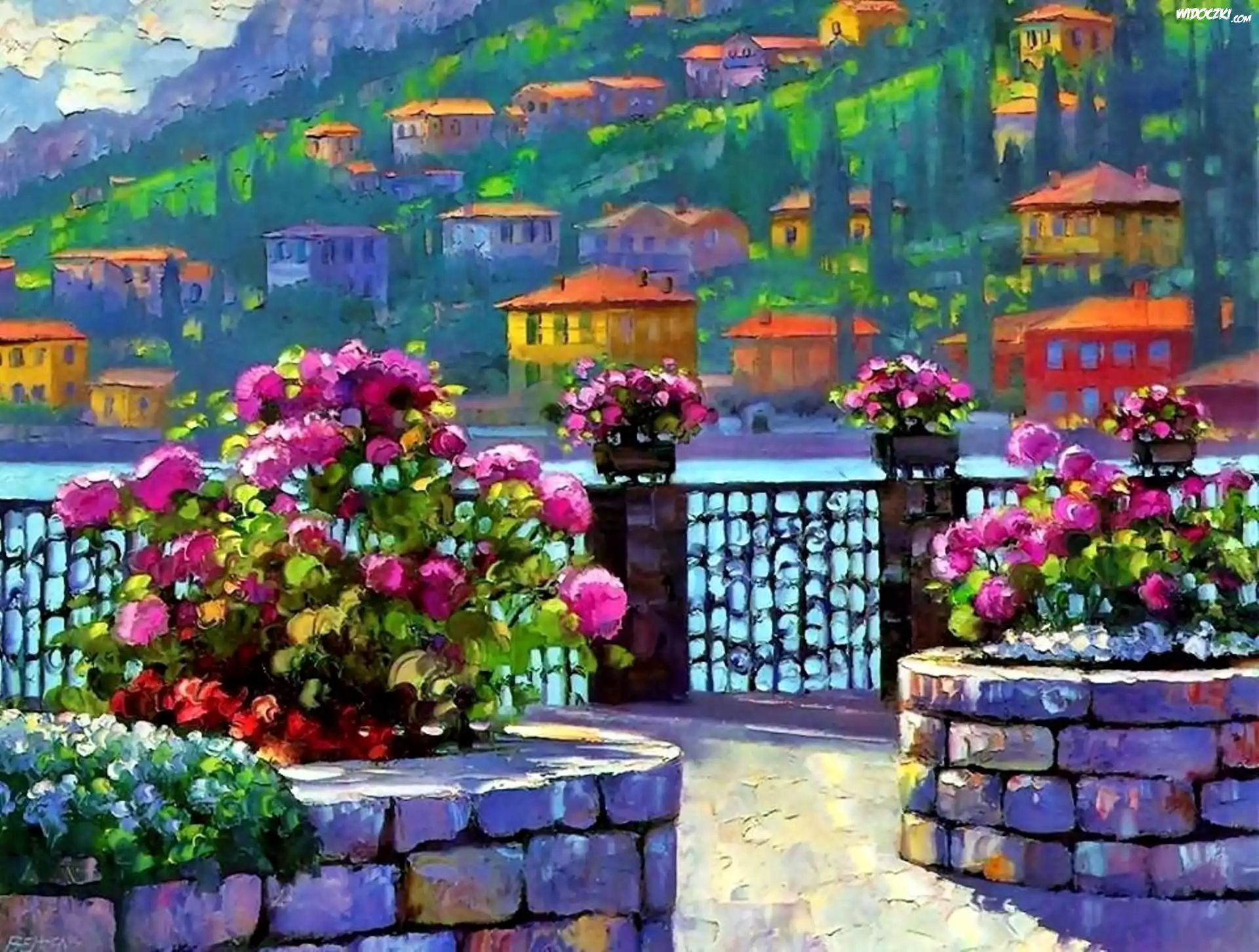 Taras, Wybrzeże, Domy, Kwiaty