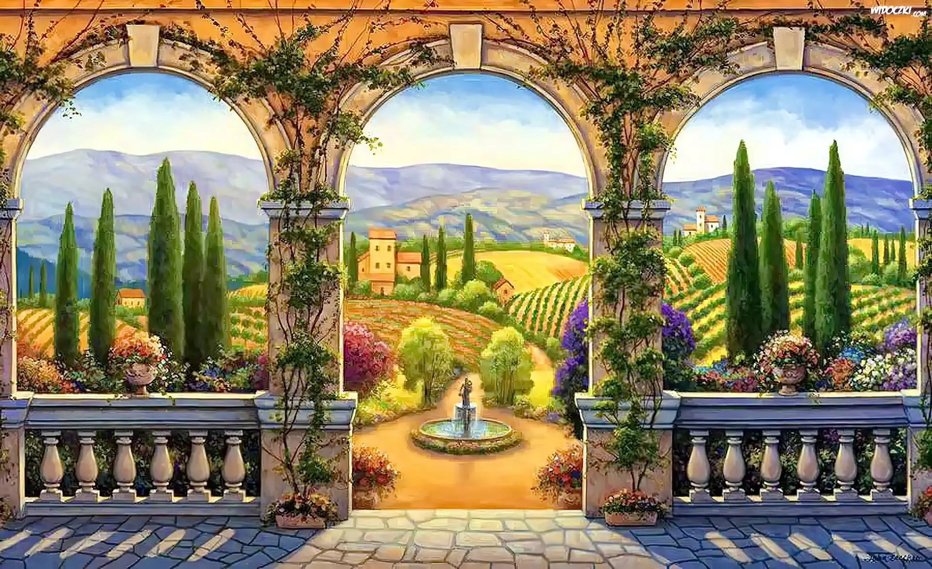 Zdjęcia, Taras, Ogród, Fontanna, Widoczek