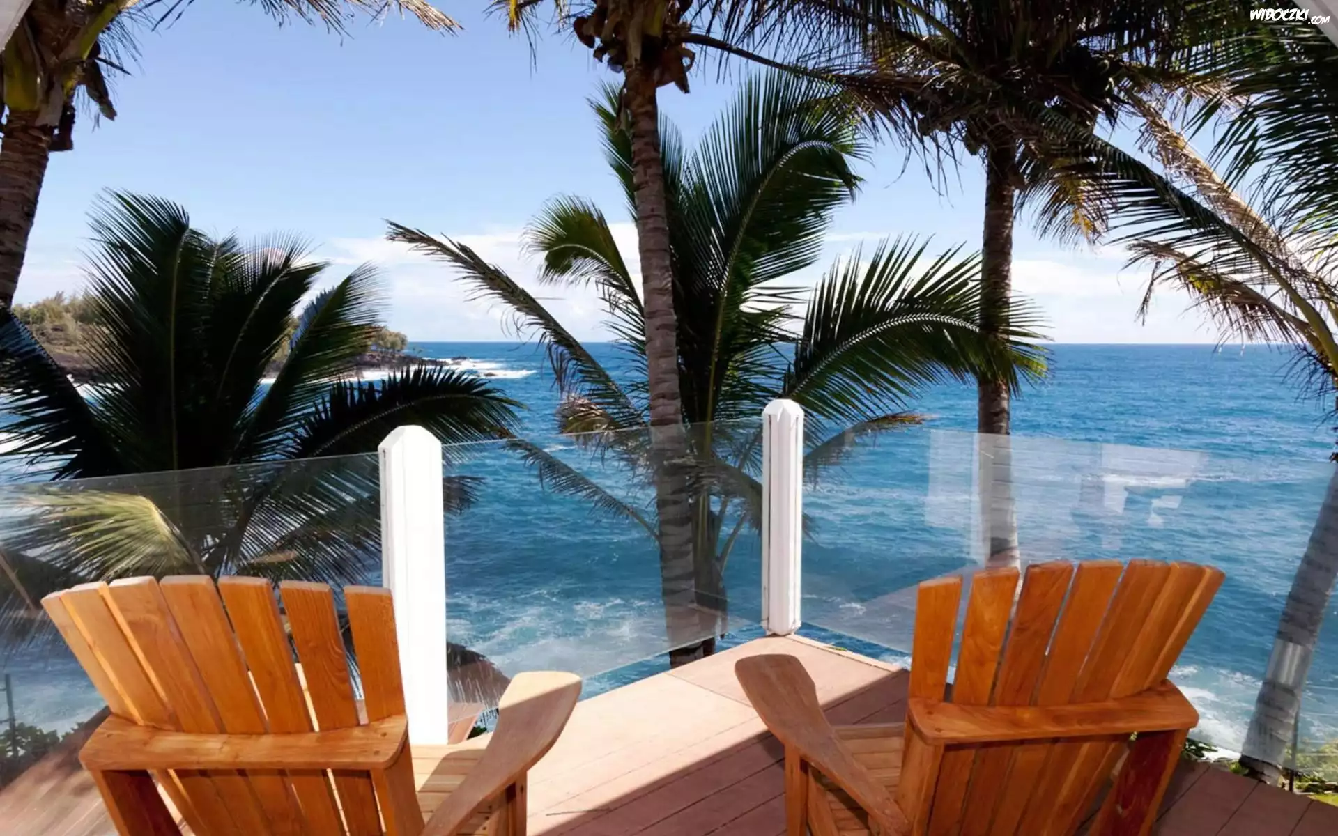 Zdjęcia, Taras, Krzesła, Morze, Palmy