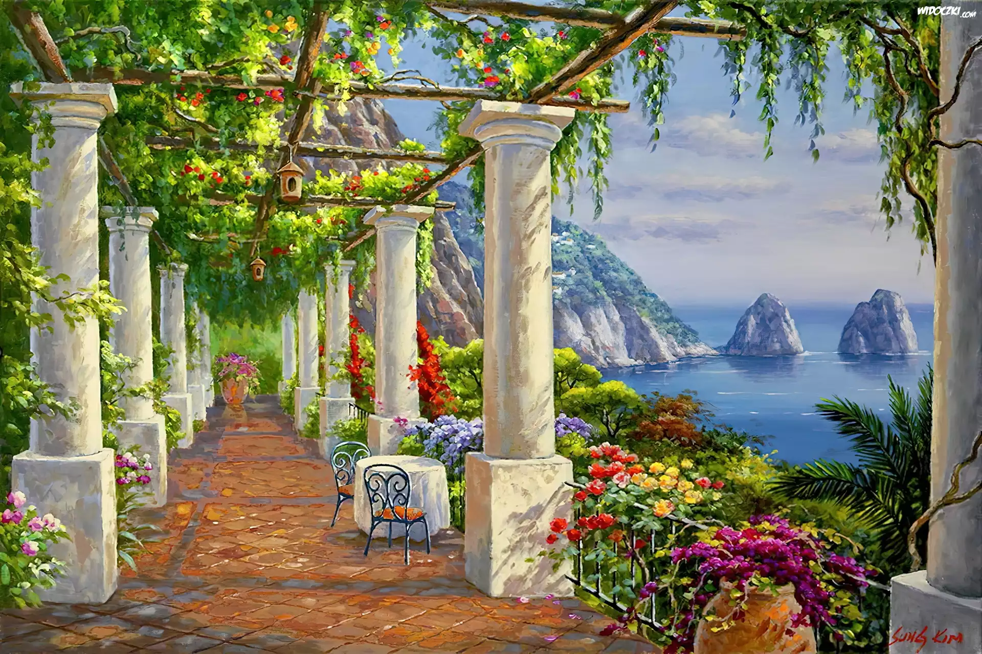 Zdjęcia, Taras, Kolumny, Widok, Morze, Góry