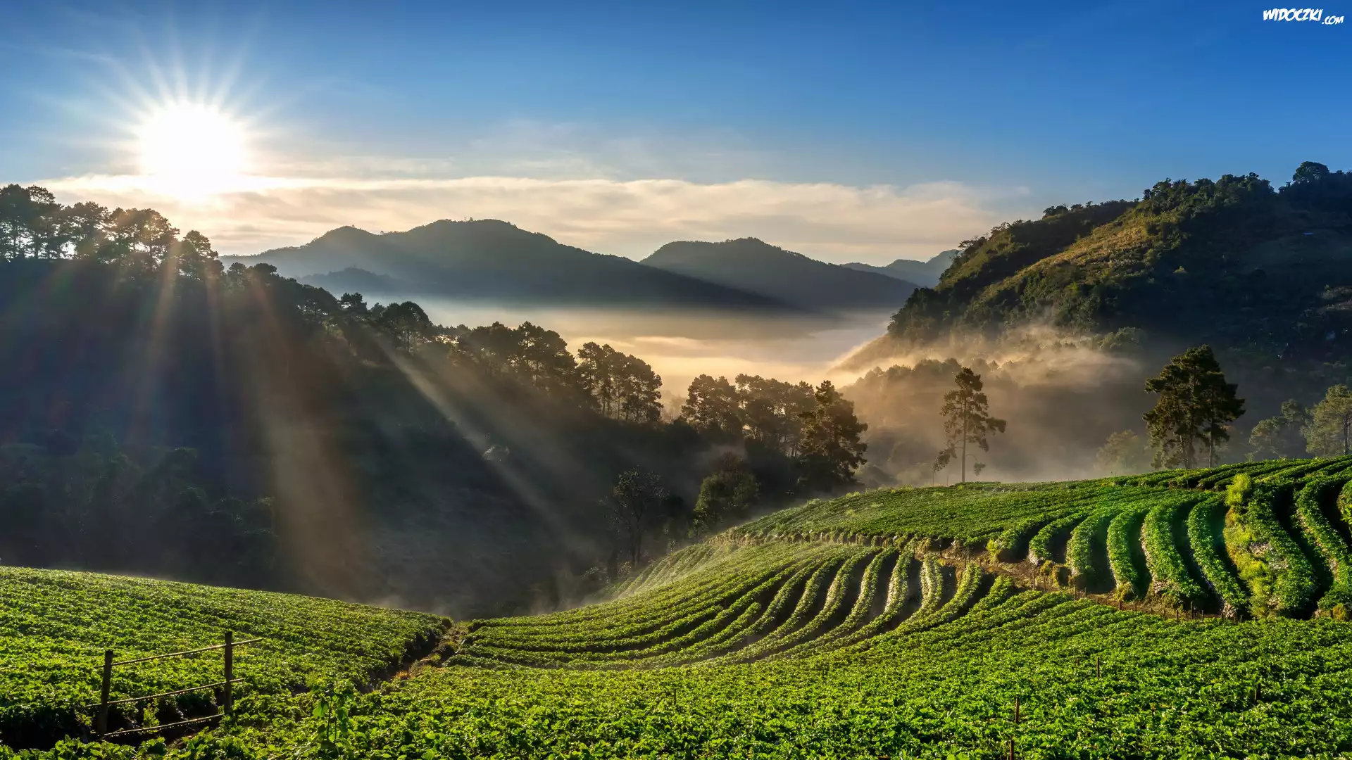 Wschód słońca, Góry, Las, Drzewa, Mgła, Pola, Tarasy