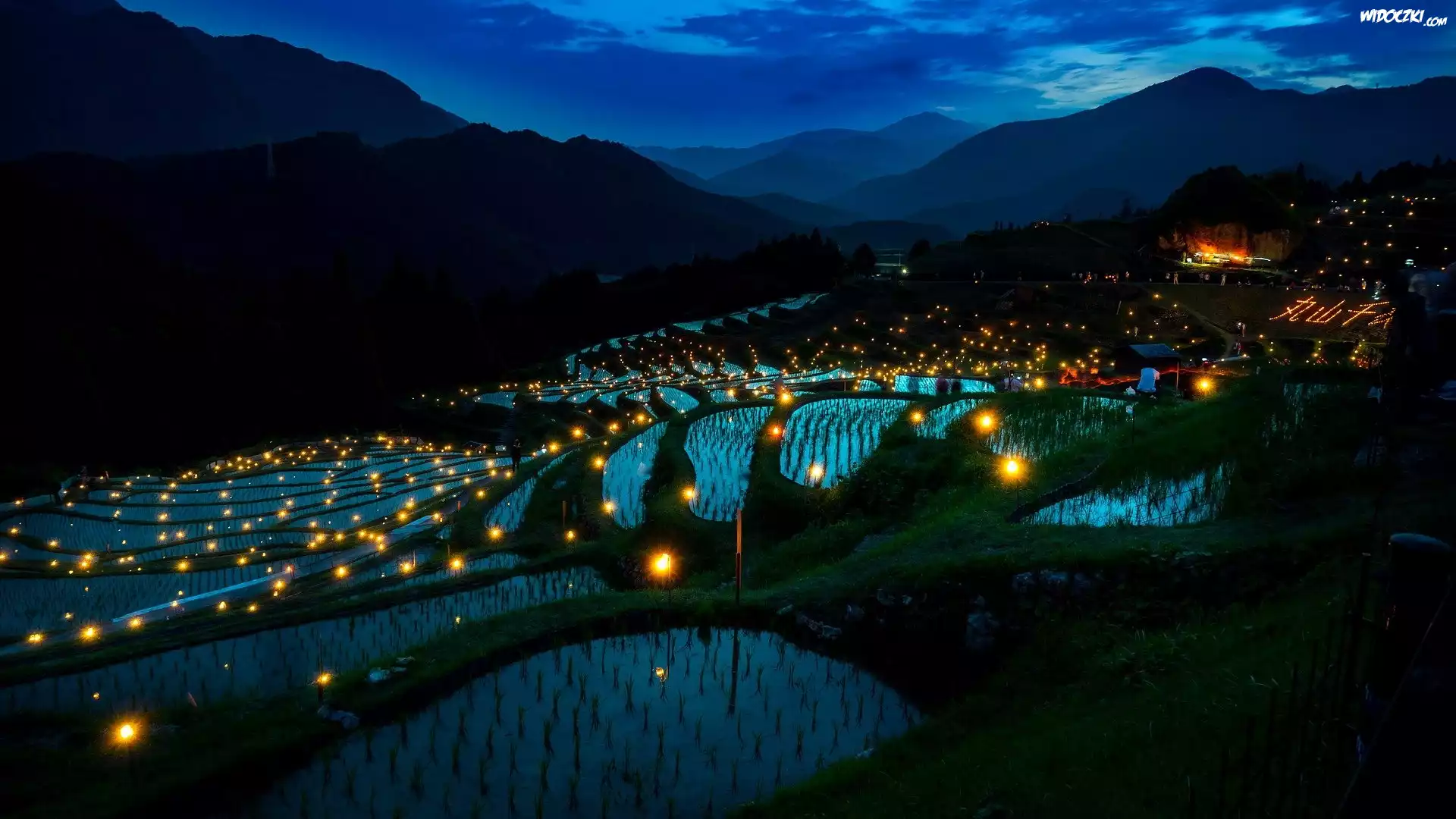 Zdjęcia, Pola, Tarasy ryżowe, Pochodnie, Święto Mushiokuri, Góry, Japonia
