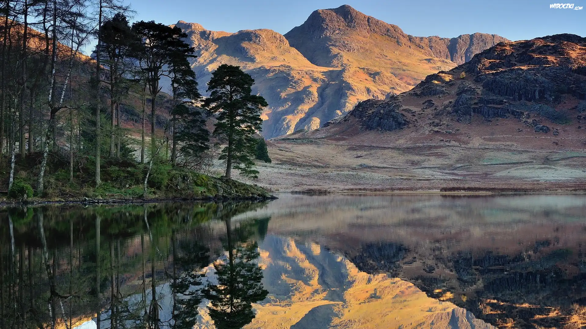 Góry, Szczyty, Langdale Pikes, Jezioro, Blea Tarn Lake, Park Narodowy Lake District, Drzewa, Odbicie, Kumbria, Anglia |