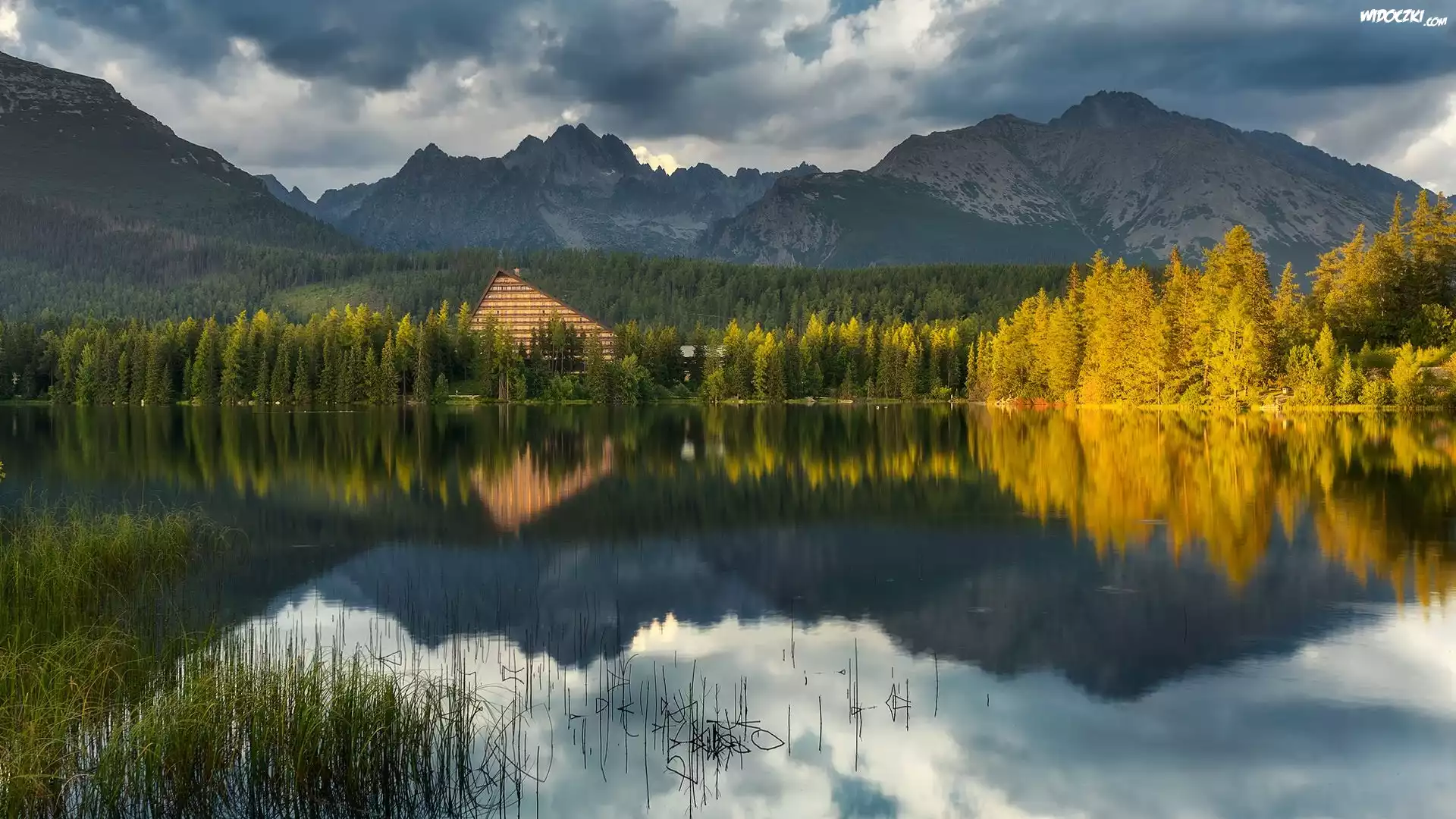 Góry, Tatry Wysokie, Lasy, Szczyrbskie Jezioro, Chmury, Słowacja